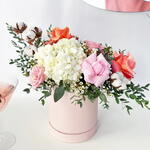 Подарите себе высшее выражение любви с нашей композицией «Цветы любви». Эта эксклюзивная композиция состоит из нежных светло-розовых и коралловых роз, гортензий и натуральных хлопковых стеблей. Все эти композиции искусно оформлены в очаровательную коробку с персиковыми цветами и станут уникальным и запоминающимся подарком на День святого Валентина.