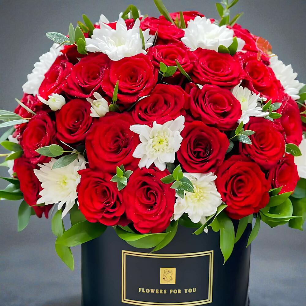 Red rose - 30 шт. white chrysanthemum - 10 шт. floral box - 1 шт.