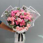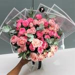 10 веток кустовых роз розового и тёмно-розового цвета, завернутых в прозрачную бумагу.
