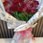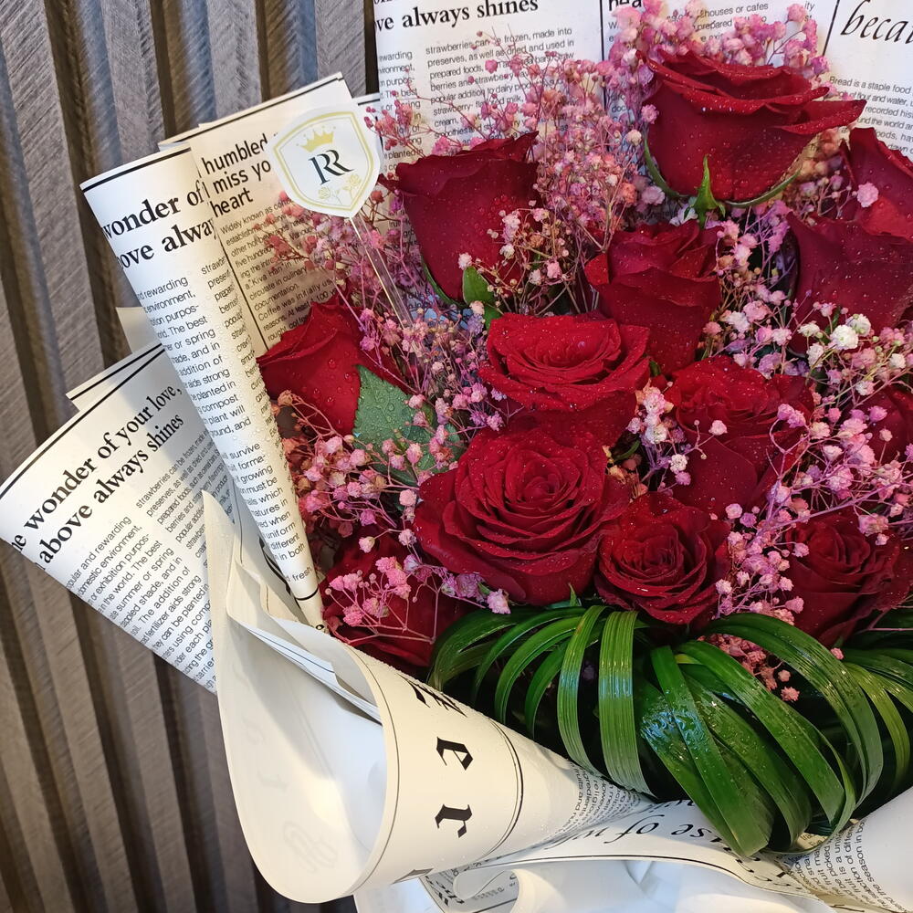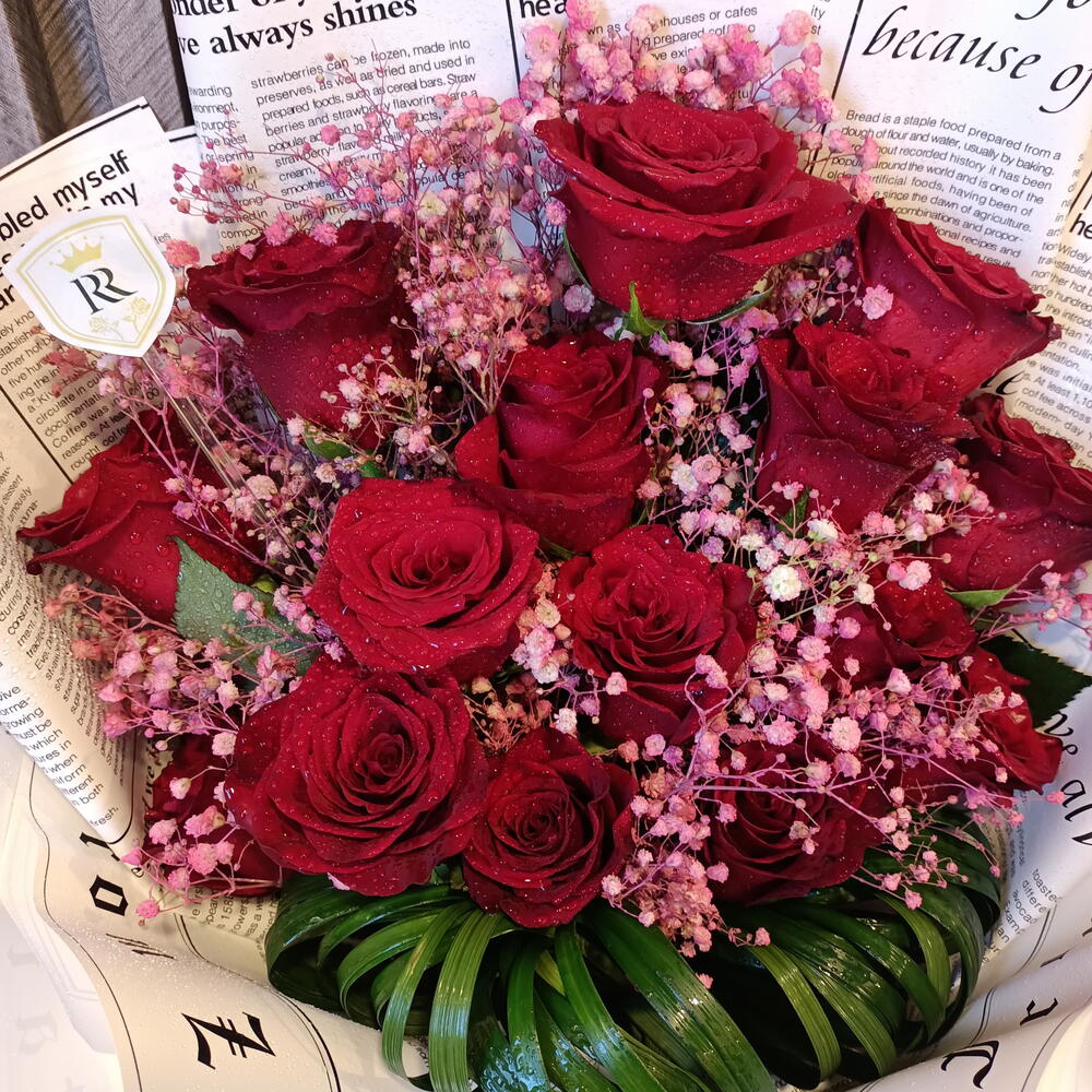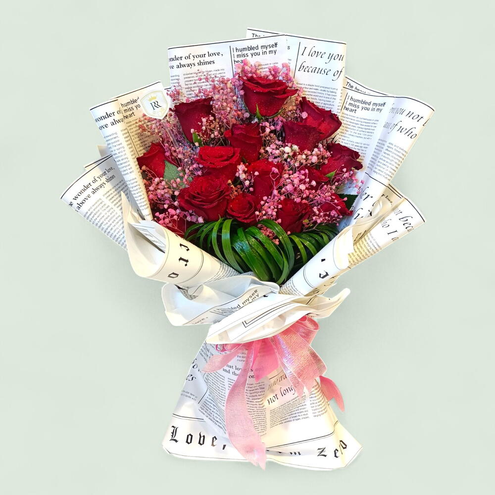 Выразите свою любовь этим стильным букетом с классическими красными розами, дополненными нежными розовыми мелкими цветами и аккуратным воротничком из сложенных листьев. Уникально упакован в бумагу, украшенную романтическими словами и каллиграфией, и перевязан мягкой розовой лентой.