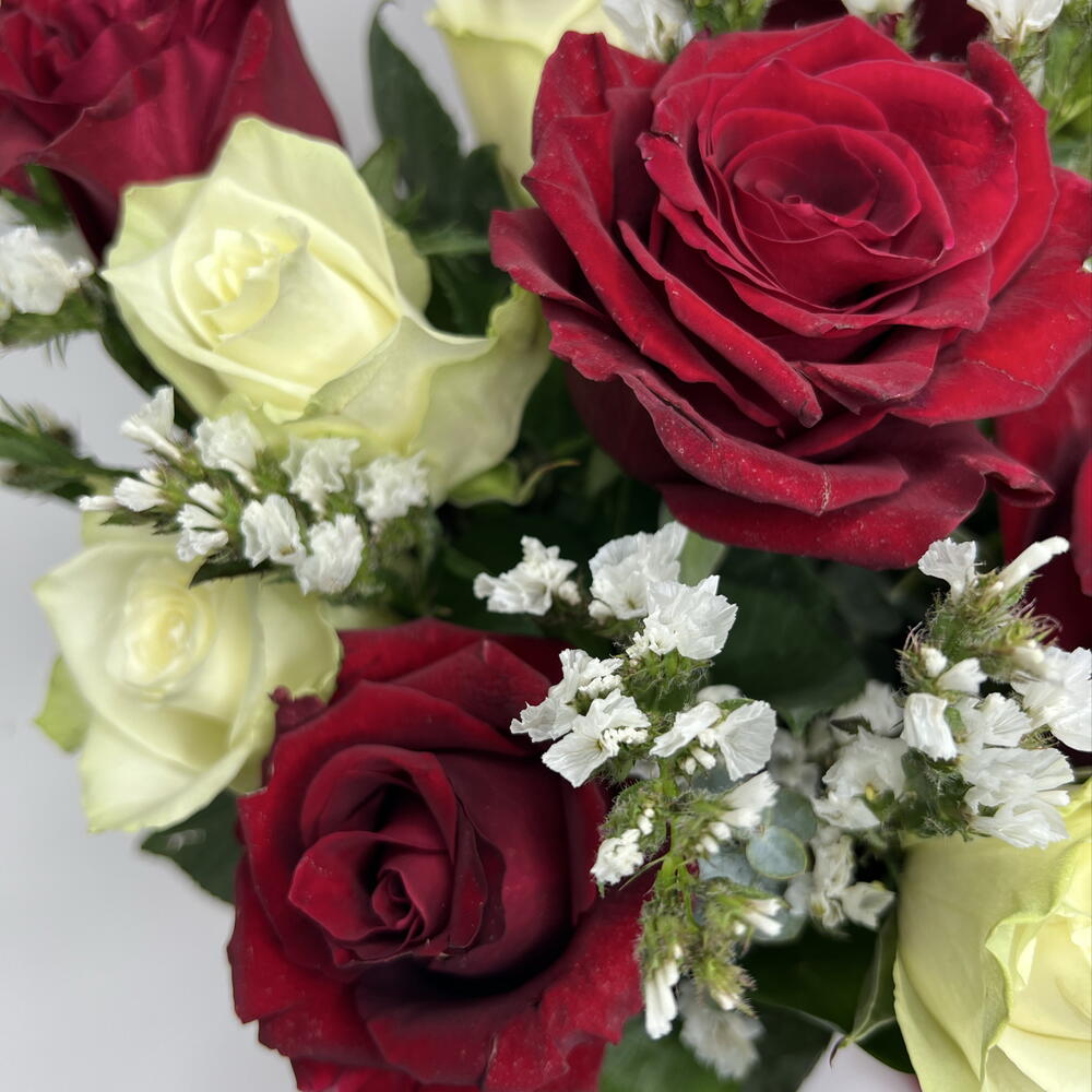 Immerse yourself in the whimsy of nature with our exquisite Flowers in a Box. This arrangement features a heavenly bundle of 4 delicate Statice flowers, lending an air of grace and subtlety, perfectly balanced by 6 Athena roses that emanate love and beauty. Adding a dash of bold elegance are 5 Ever Red roses, radiating passionate emotions. Majestically nestled in a sophisticated box, these blooms enchant with their timeless charm and evoke a sense of serenity and wonder. The perfect statement piece to brighten up your space.