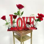 Деревянный поднос с пятью красными розами и такими же сипсофилами