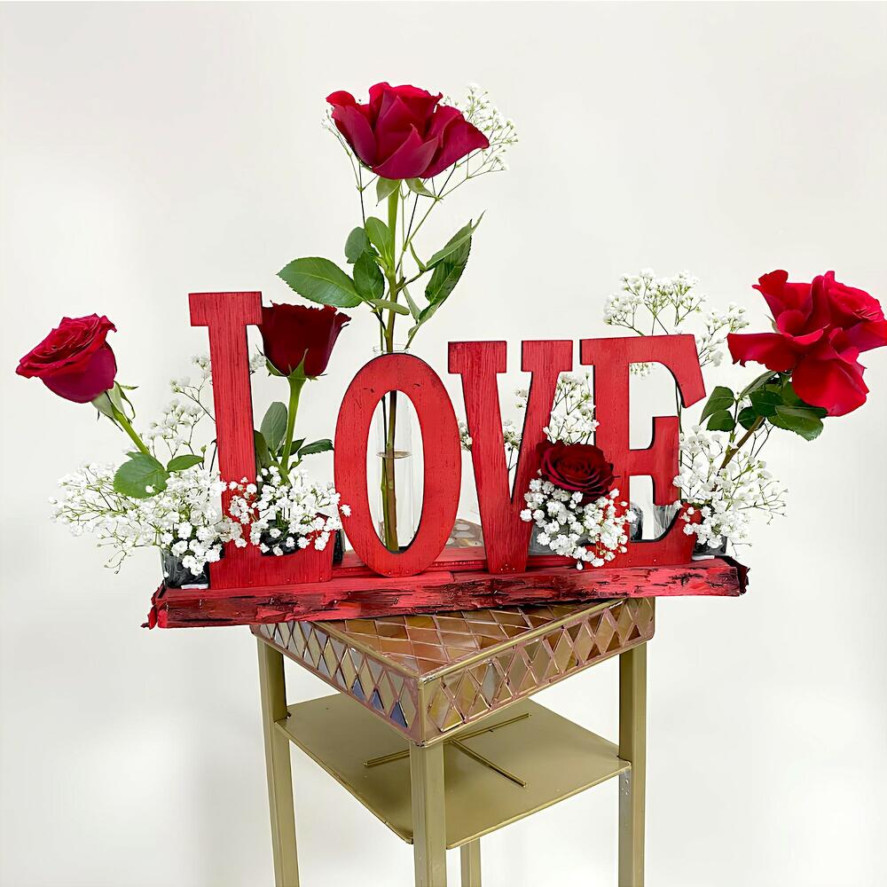 red roses - 5 шт. белая гипсофила - 1 шт. поднос любви - 1 шт.