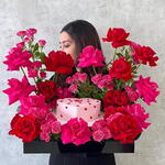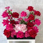 Red rose - 10 шт. Pink rose - 10 шт. pink spray rose - 40 шт. поднос - 1 шт. торт 500 грамм - 1 шт.