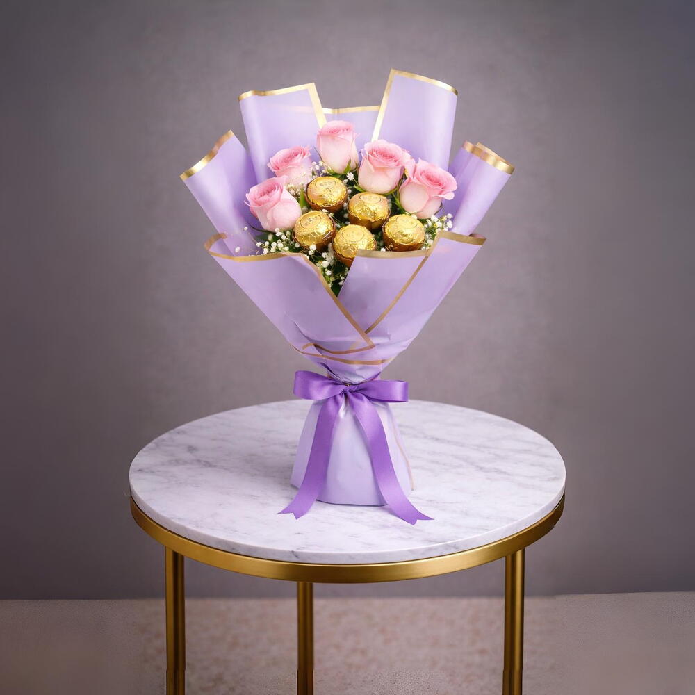 5 свежих розовых роз вместе с 5 конфетами Ferrero Rocher, красиво упакованы для сладкого и элегантного подарка.