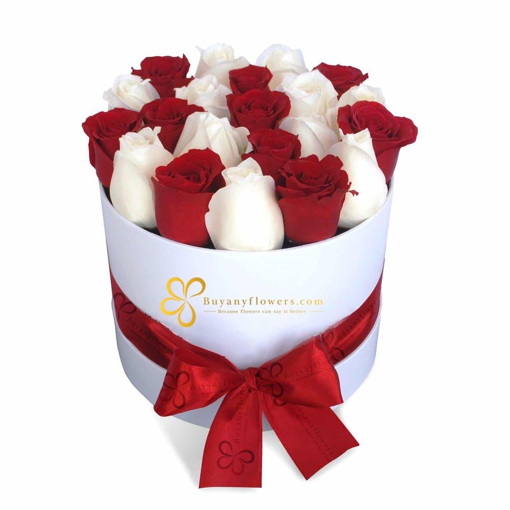 Детали товара красивая композиция из 20–22 красных и белых роз в небольшой белой круглой коробке.