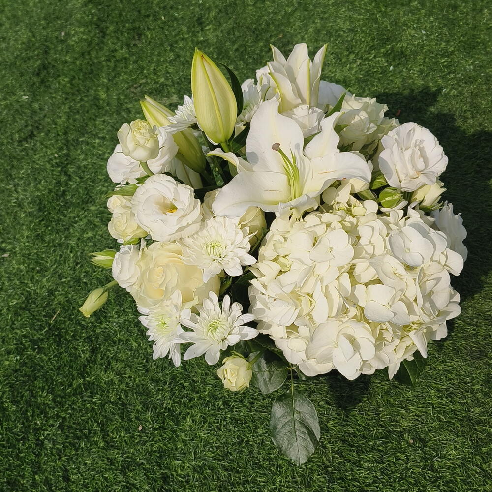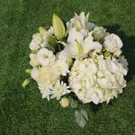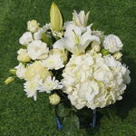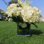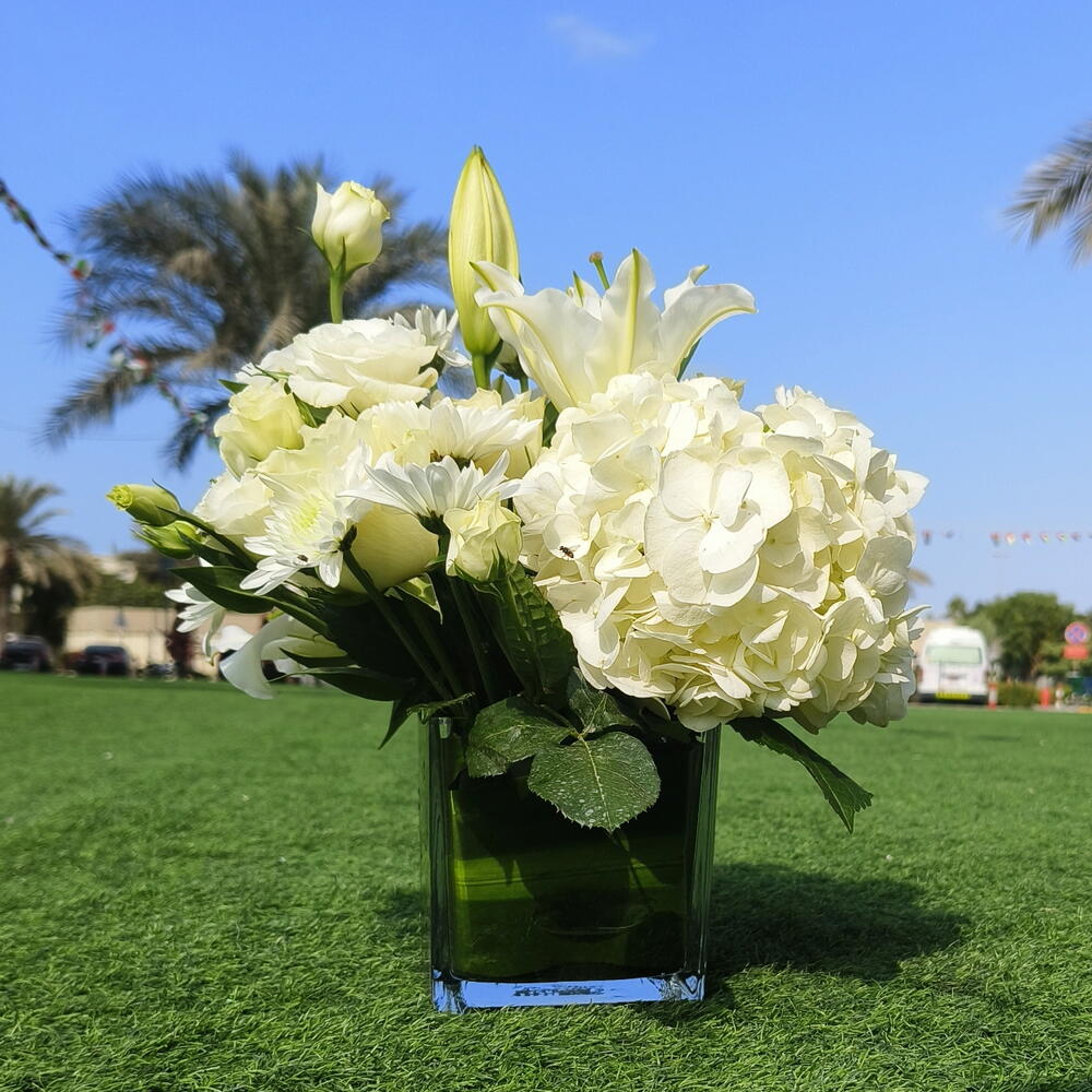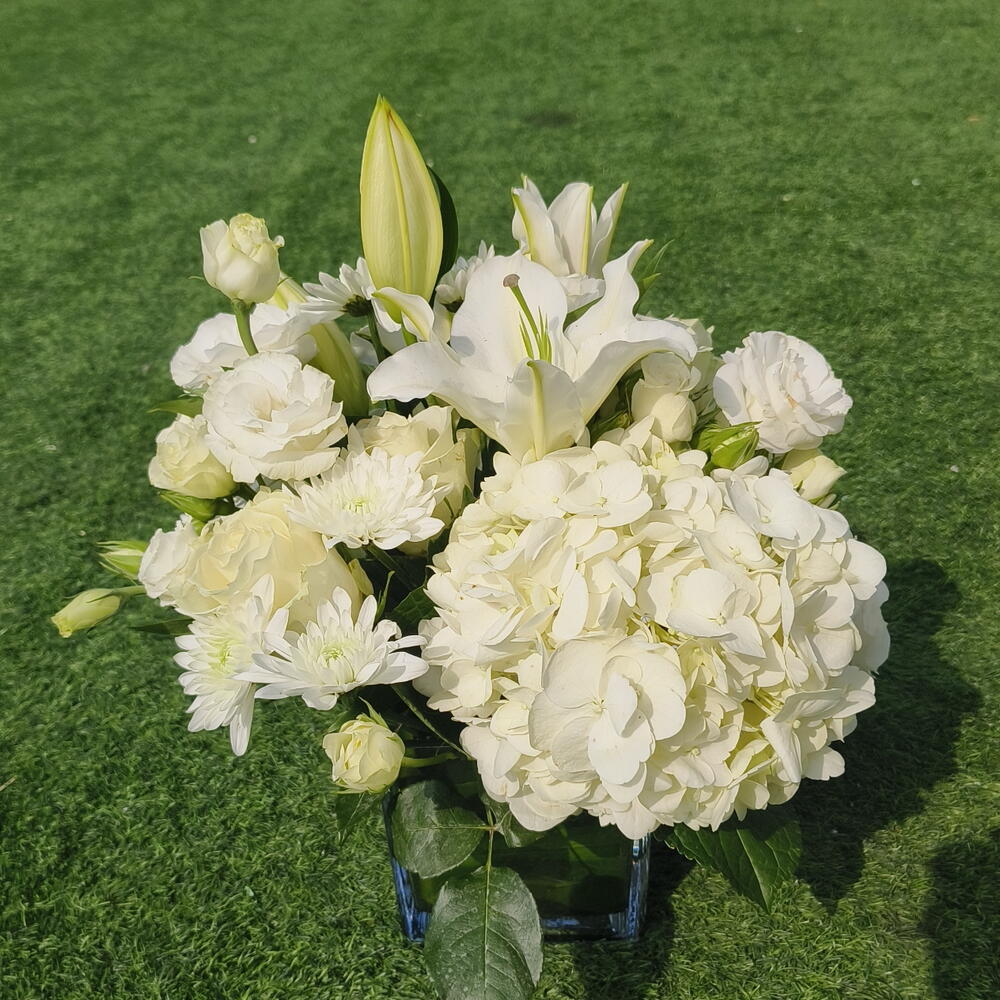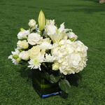 Chrysanthemum - 2 шт. glass vase - 1 шт. white lilly - 2 шт. гортензия белая - 1 шт. лизиантус белый - 2 шт. белая стеклянная композиция - 1 шт.