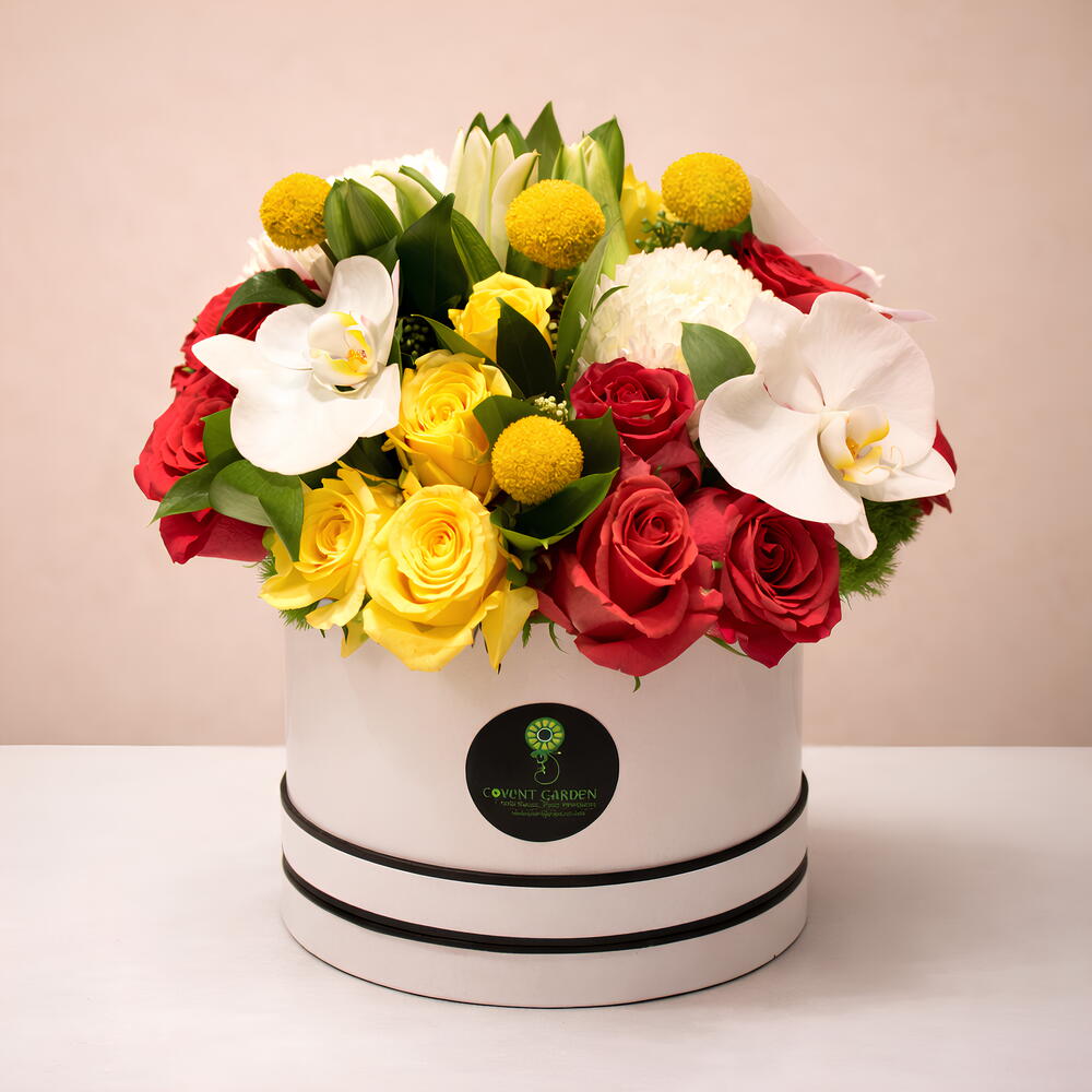 Loyal Box Magic: композиция из тёмно-розовых и жёлтых роз, белой орхидеи, каспии и лилий «Касабланка»