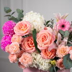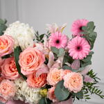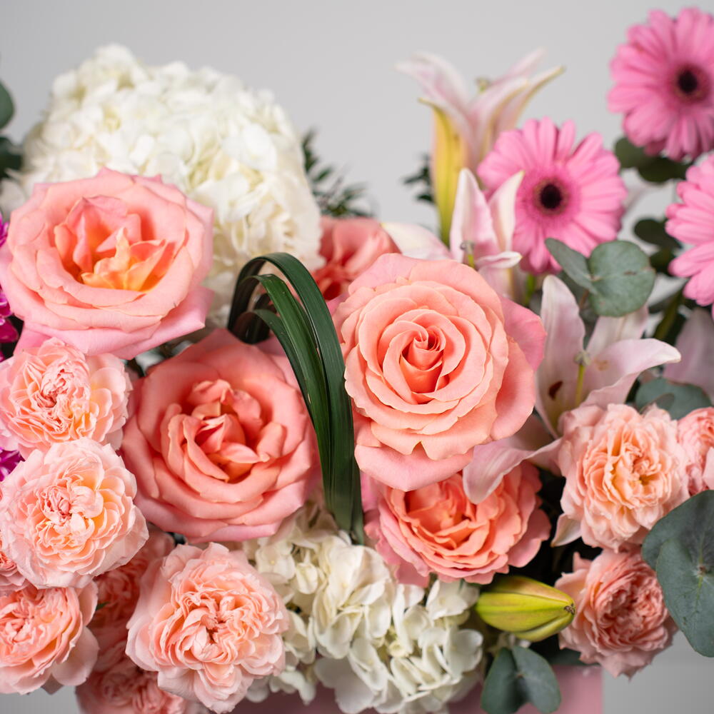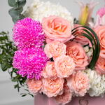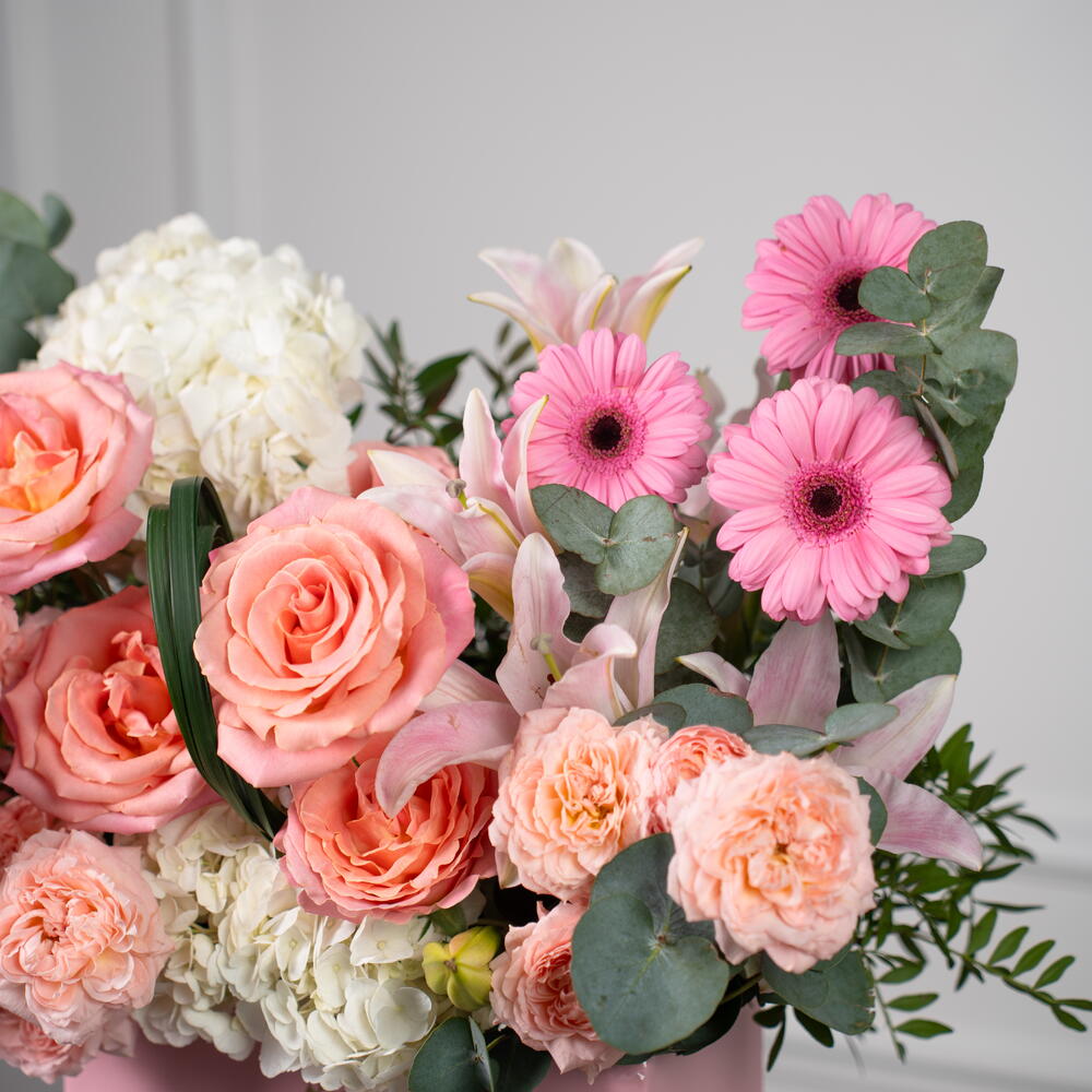 Eucalyptus - 2 шт. hydrangea white - 2 шт. rose hermosa - 5 шт. гермини розовая - 3 шт. розовая лилия - 1 шт. листья фисташки - 3 шт. хризантема пионы розовый - 2 шт. спрей-роза джульетта персиковая - 4 шт.