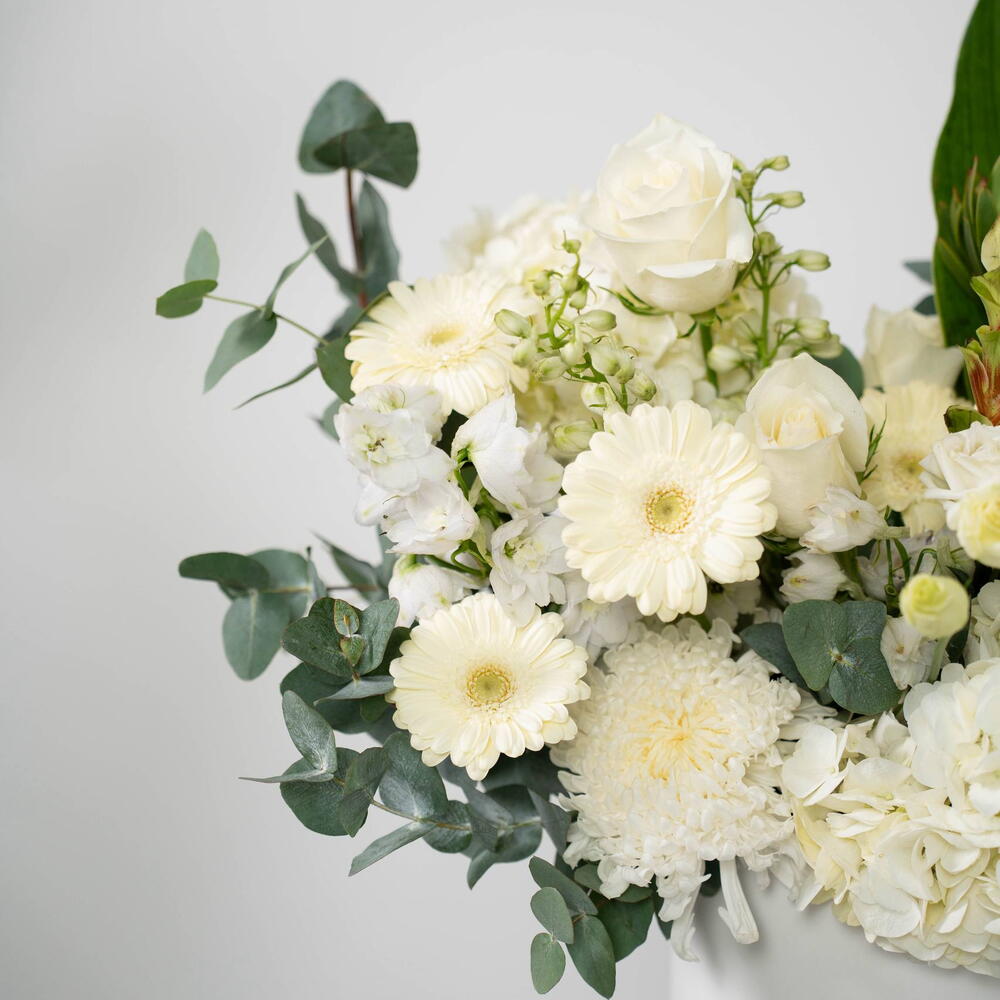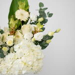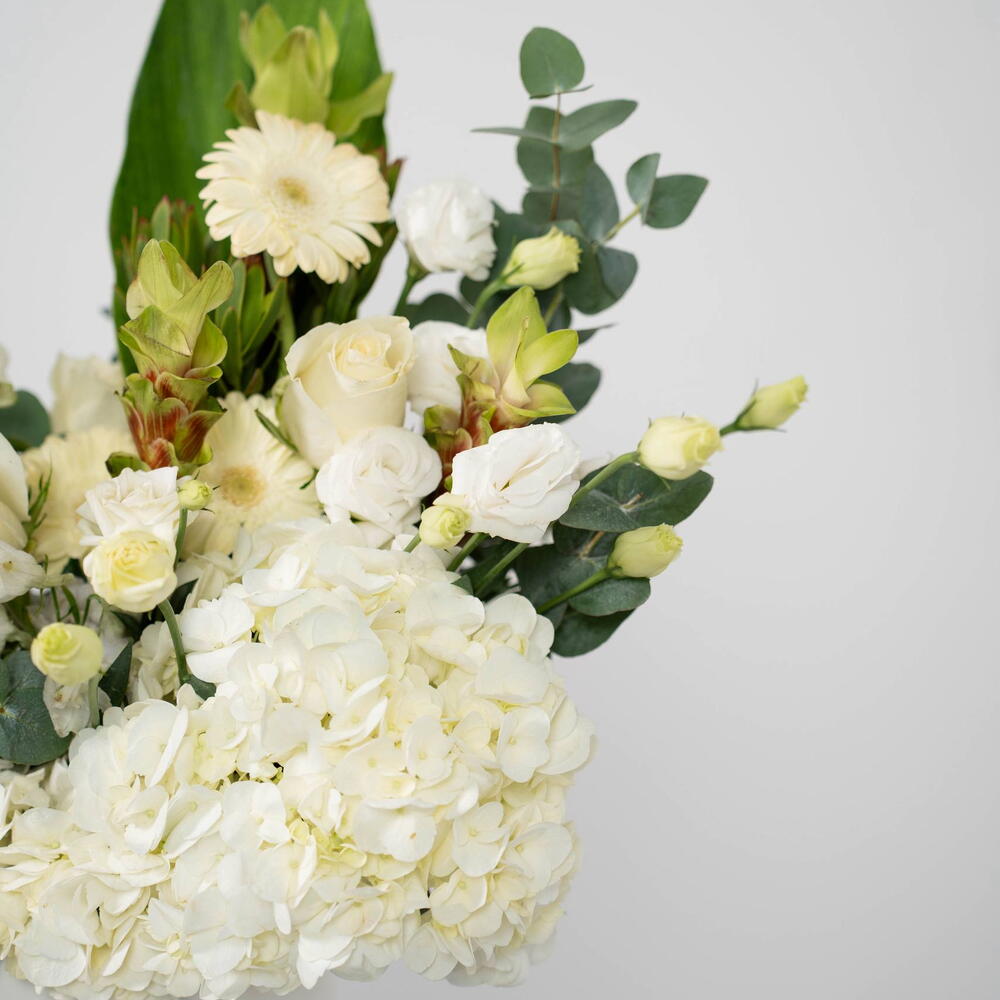 Eustoma white - 3 шт. rose white - 4 шт. hydrangea white - 3 шт. гермини белая - 6 шт. delphinium white - 1 шт. хризантемы пионы белые - 1 шт. зелёная куркума - 3 шт.