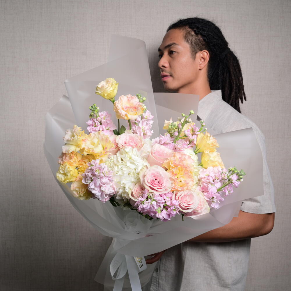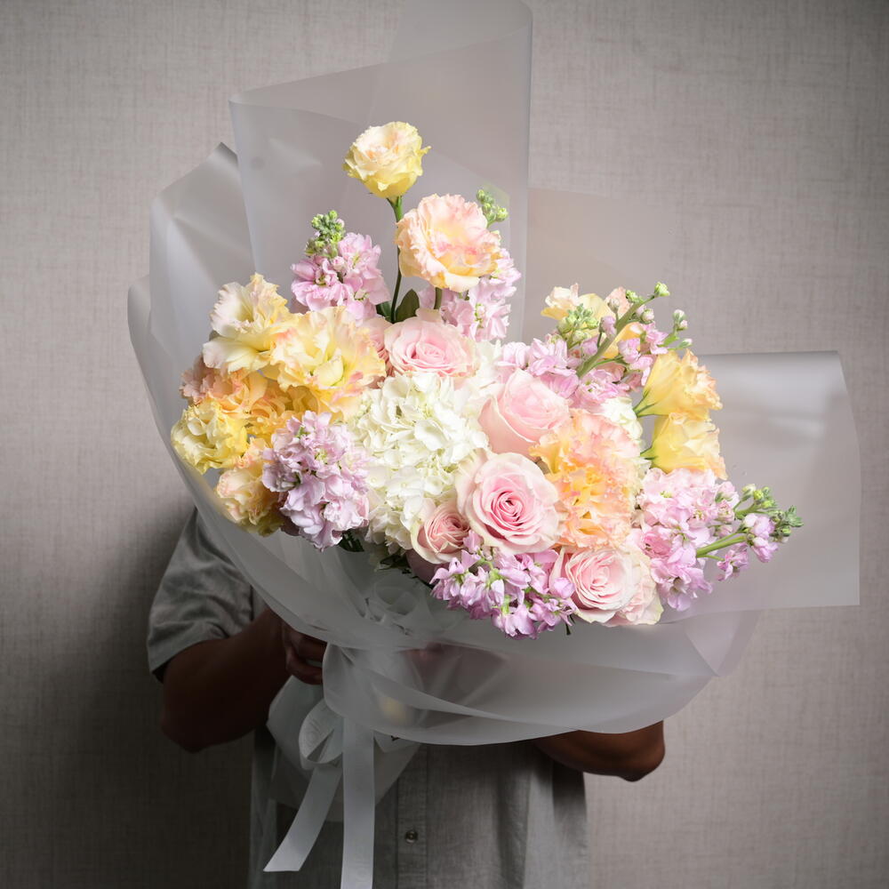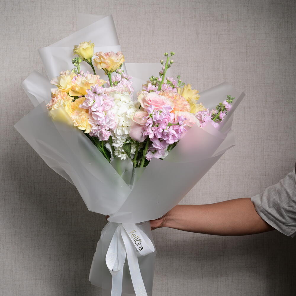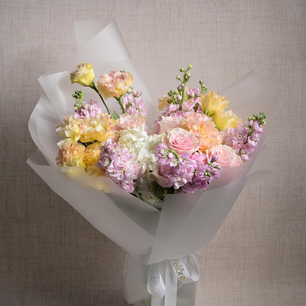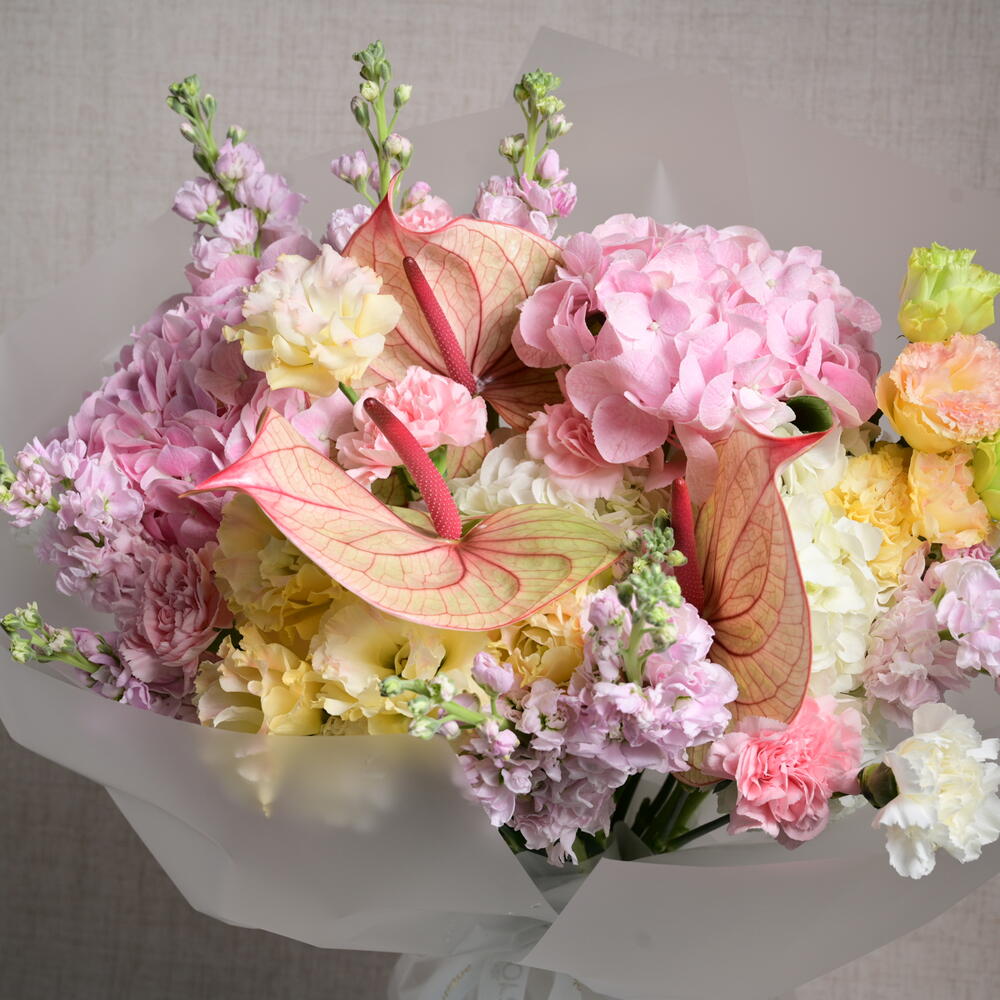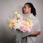 Завораживающая цветочная композиция с 3 гортензиями, 5 розами Mondial, 10 маттиолами и 6 эустомами, искусно объединёнными в изящный и чарующий букет, идеальный для любого случая.