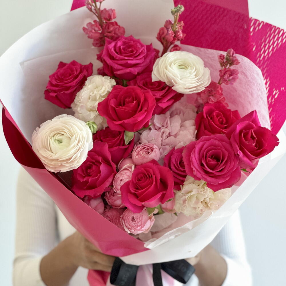 Яркий и прекрасный, этот букет — потрясающее торжество розового во всех его оттенках. Фуксиевые розы выходят на первый план, окружённые пышными соцветиями розовой гортензии и нежной элегантностью розового лизиантуса. Нежные розовые спрей-розы и сладкий аромат розовой маттиолы придают глубину и текстуру, в то время как гармоничное сочетание цветов создаёт эффектную и в то же время женственную композицию. Идеально подходит для выражения любви, радости или восхищения, этот букет наверняка произведёт неизгладимое впечатление своим насыщенным цветом и живой энергией.