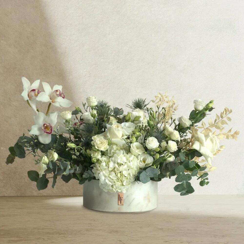 Spray rose - 5 шт. Hydrangea - 1 шт. Limonium - 2 шт. Lisianthus - 4 шт. rose - 5 шт. отбелённый рускус - 2 шт. цимбидиум (1 стебель) - 1 шт. эвкалипт (1 пучок) - 1 шт. мраморная миска - 1 шт.