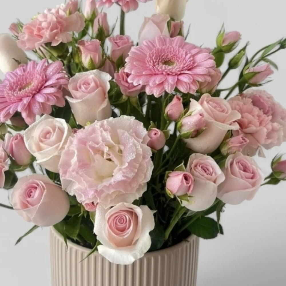 Pink rose - 10 шт. pink carnations - 6 шт. розовые спрей-розы - 10 шт. розовые герберы - 3 шт. керамическая ваза - 1 шт.