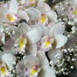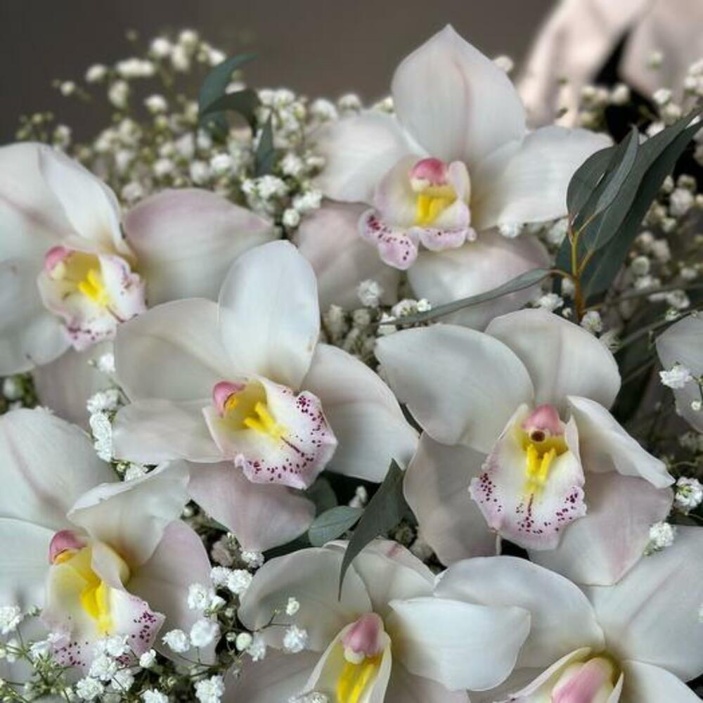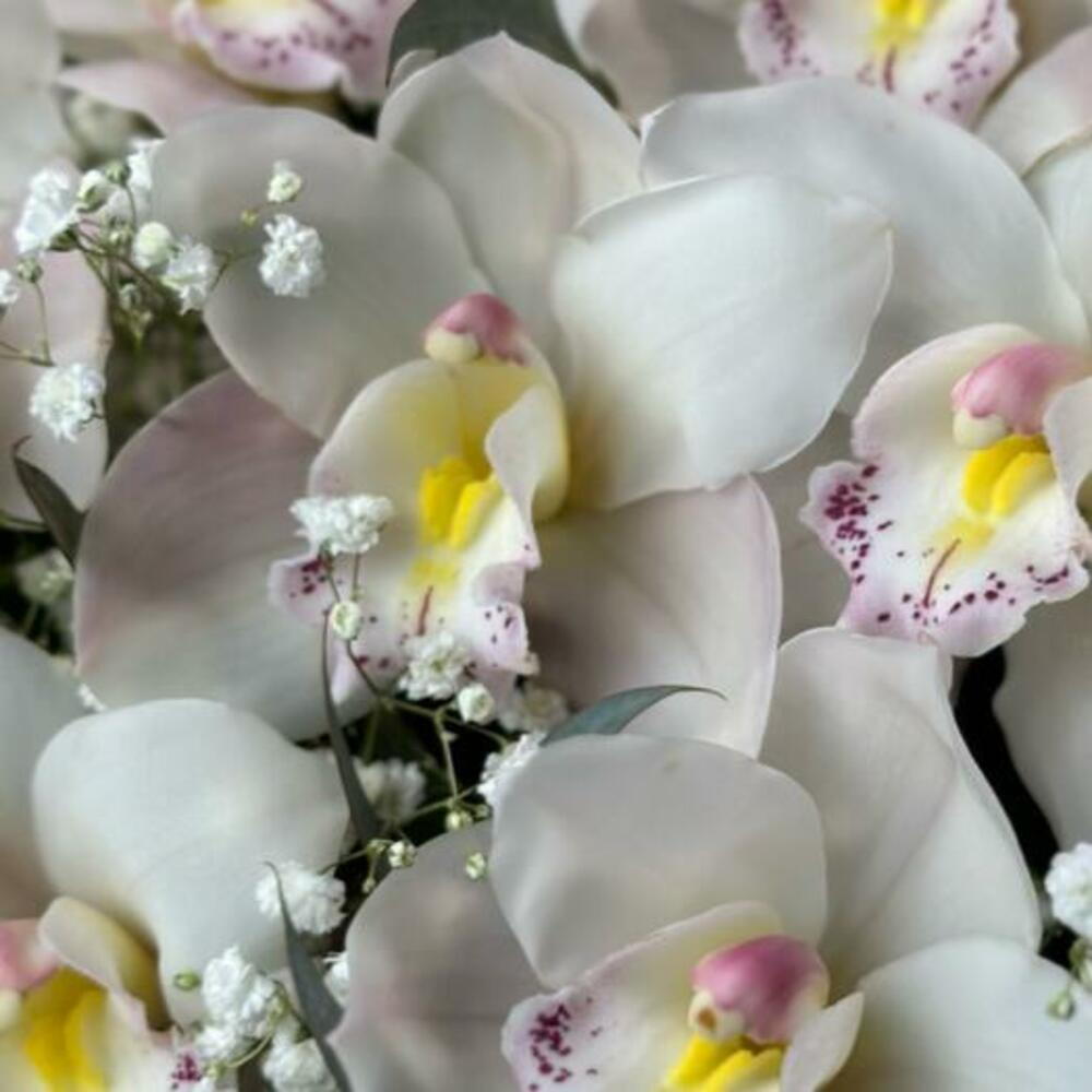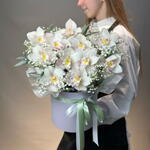 Gypsophila - 5 шт. белая орхидея цимбидиум - 11 шт. пучок эвкалипта - - 1 шт. белая шляпная коробка и оазис - 1 шт.