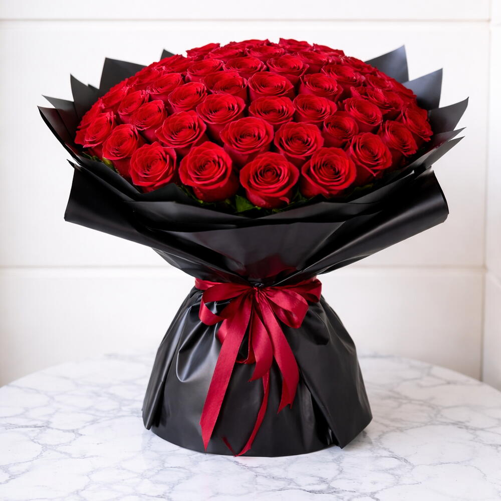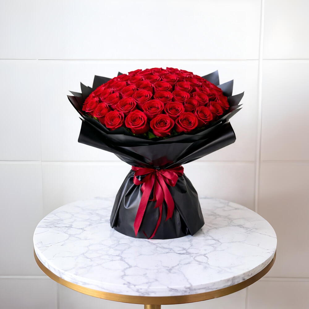 Погрузитесь в очарование захватывающей дух красоты с этим монобукетом из 41 изысканной красной розы, который непременно вызовет восхищение. Букет, обернутый декоративной черной оберточной бумагой, которая элегантно контрастирует с насыщенной красной палитрой, перевязан атласной лентой, что добавляет ему изысканности. Этот сияющий ансамбль излучает страстную любовь и глубокую привязанность, являясь идеальным выражением ваших сильных чувств.