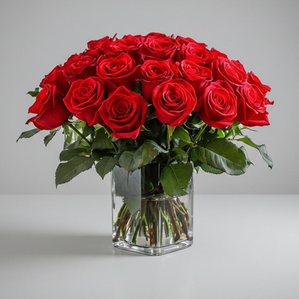 premium red roses - 21 шт. современная стеклянная квадратная ваза - 1 шт.