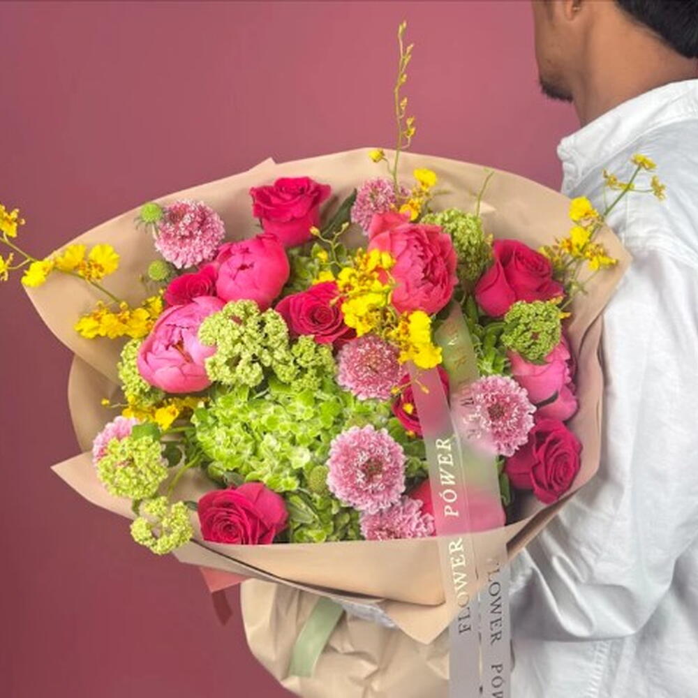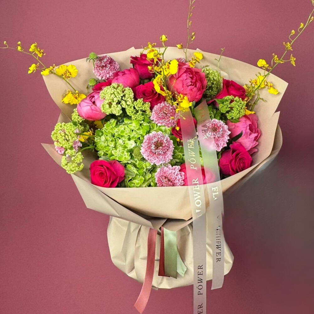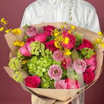 Особенный букет, сочетающий мягкие гортензии, ярко-зелёный вибурнум и гвоздики, а также нежные спрей-розы и классические розы. Свежая и мечтательная композиция, идеально подходящая для празднования новых начинаний или чтобы скрасить любой день.