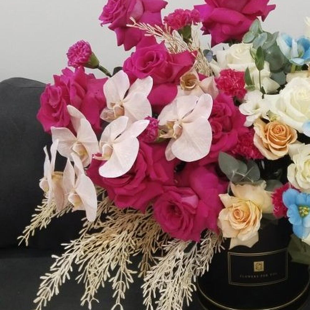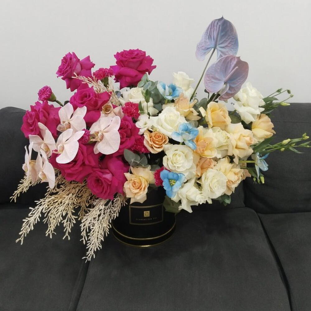 Роскошная смешанная цветочная композиция — розы, орхидеи и антуриумы в дизайнерской черной коробке Эта роскошная цветочная композиция сочетает яркие розы, изящные орхидеи, нежные голубые антуриумы и смесь белых, персиковых и нежно-розовых цветов. Элегантно оформленная в дизайнерской черной коробке, эта уникальная композиция идеально подходит, чтобы произвести впечатление на мероприятиях, юбилеях или послужить роскошным подарком. Каждый цветок тщательно отобран с целью свежести и красоты, создавая изысканное сочетание цветов и фактур. Доставка доступна в Дубае и близлежащих районах.