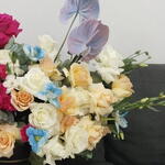 White rose - 8 шт. Антуриум - 2 шт. carnation - 8 шт. dark pink rose - 8 шт. персиковые розы - 8 шт. голубой тюльпан - 5 шт. срезанный цветок - 1 шт.