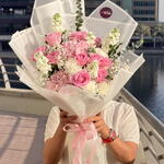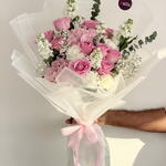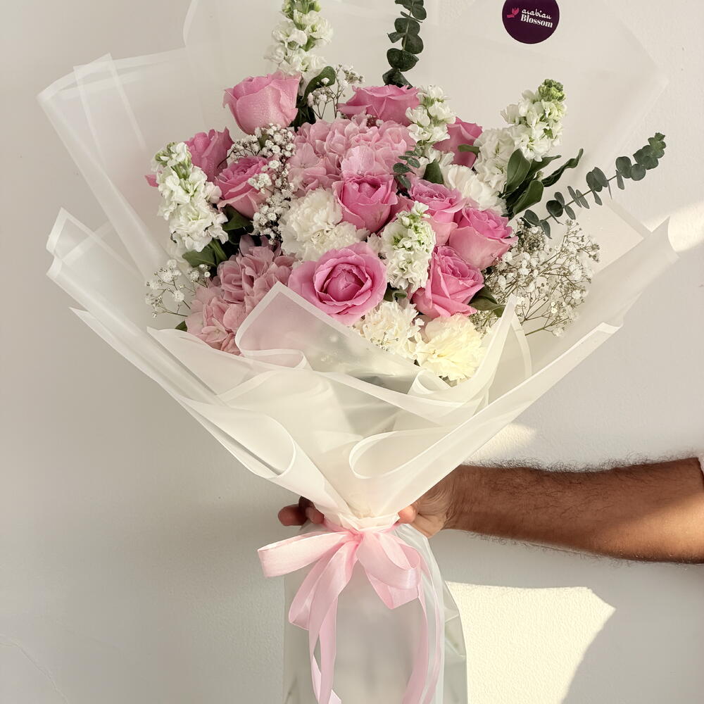Отпразднуйте элегантность и нежную романтику с этим потрясающим роскошным букетом из розовых гортензий и роз, созданным вручную из отборных свежих розовых роз, гортензий, гвоздик, гипсофилы и сезонных белых цветов. Красиво упакованный в элегантную полупрозрачную дизайнерскую бумагу и перевязанный нежно-розовой атласной лентой, этот букет создает утонченный и женственный образ. Эта композиция идеально подходит для выражения любви, признательности, благодарности или сердечных поздравлений. Сочетание нежных розовых и белых цветов делает его идеальным для романтических случаев, дней рождения, годовщин, вечеринок в честь рождения ребенка, свадебных подарков или особых сюрпризов.