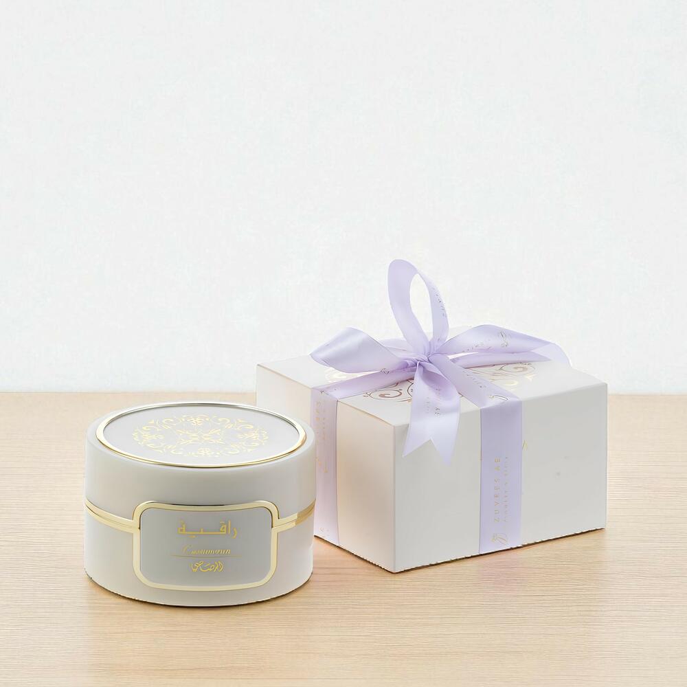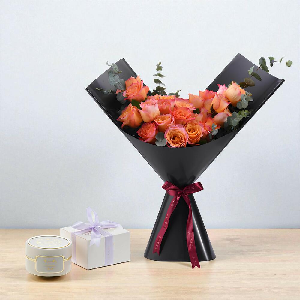 Завернутый в роскошную матовую черную бумагу и перевязанный богатой багряной лентой, букет становится более выразительным благодаря добавлению Raqiya Cashmeran Bakhoor от Rasasi (109 г) — премиального арабского аромата, известного своим теплом и утонченностью.