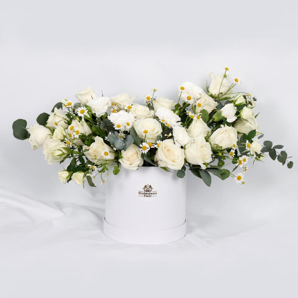 Побалуйте себя элегантностью белого цвета с нашей роскошной белой цветочной коробкой. Эта изысканная композиция состоит из 15 белых роз, 5 белых хризантем, 4 зелёных эвкалиптовых веток и 4 белых кустовых роз. Все они тщательно отобраны, чтобы создать захватывающее дух зрелище. Эта композиция, упакованная в белую картонную коробку в стиле Шекспира, излучает изысканность и очарование, что делает её идеальным подарком для любого особого случая.