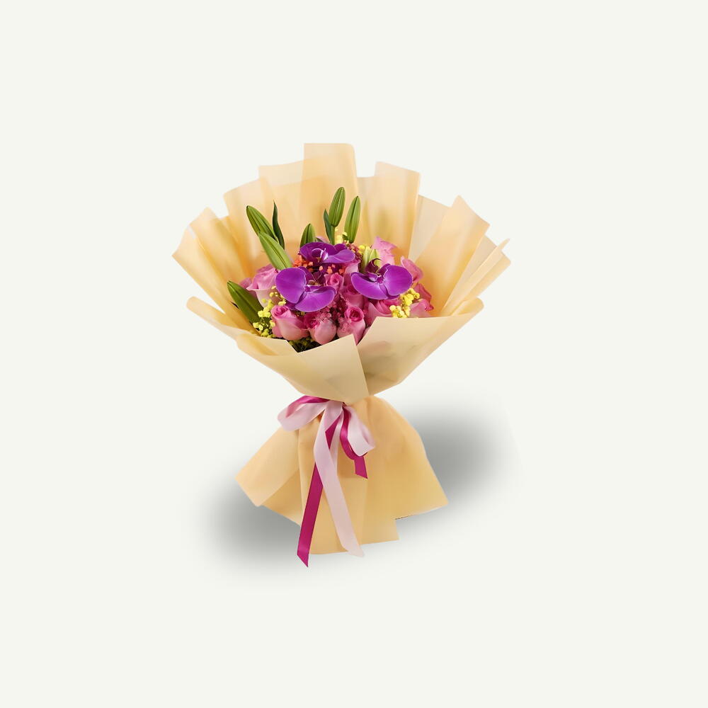 Букет, собранный вручную из 3 фиолетовых орхидей, 20 розовых роз, 2 стеблей лилий и гипсофилы, бережно упакован в роскошную золотую обертку.