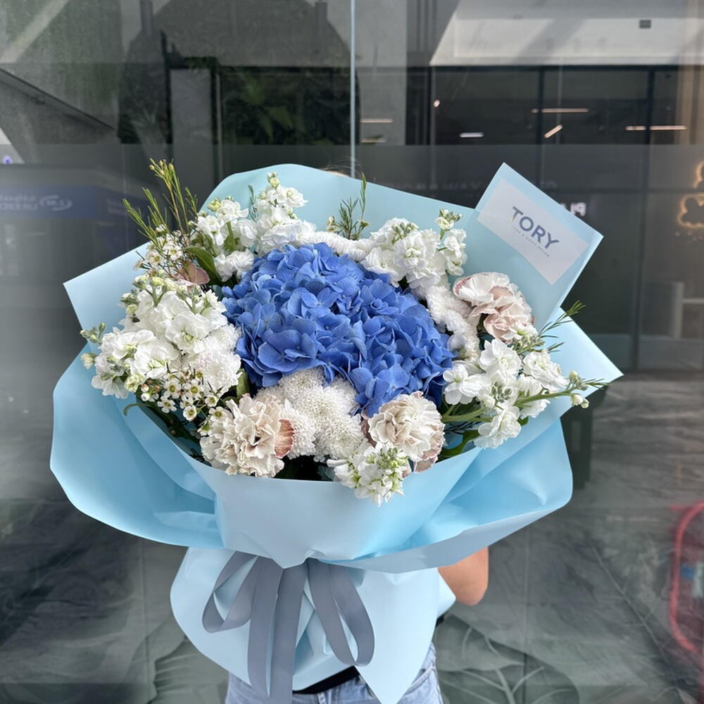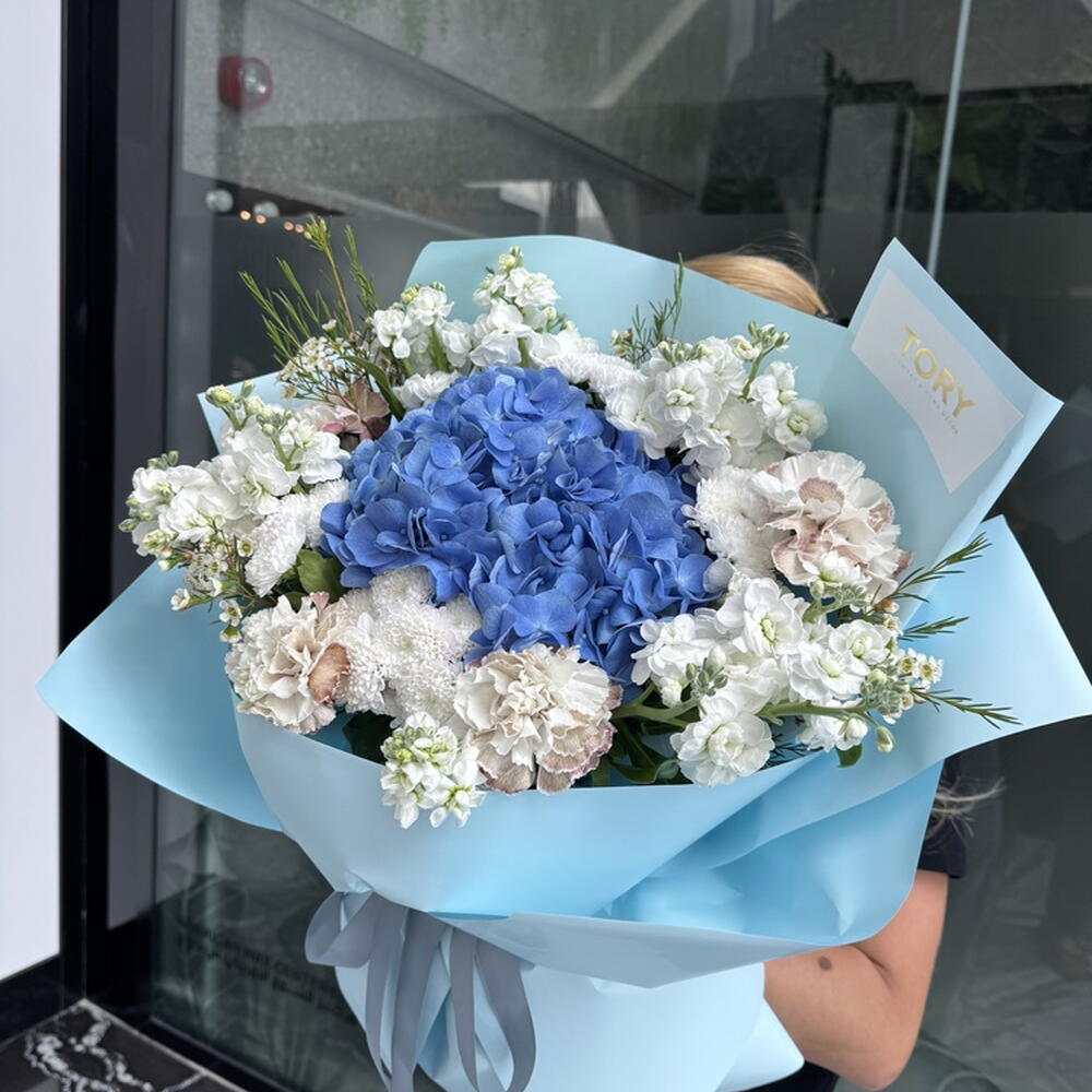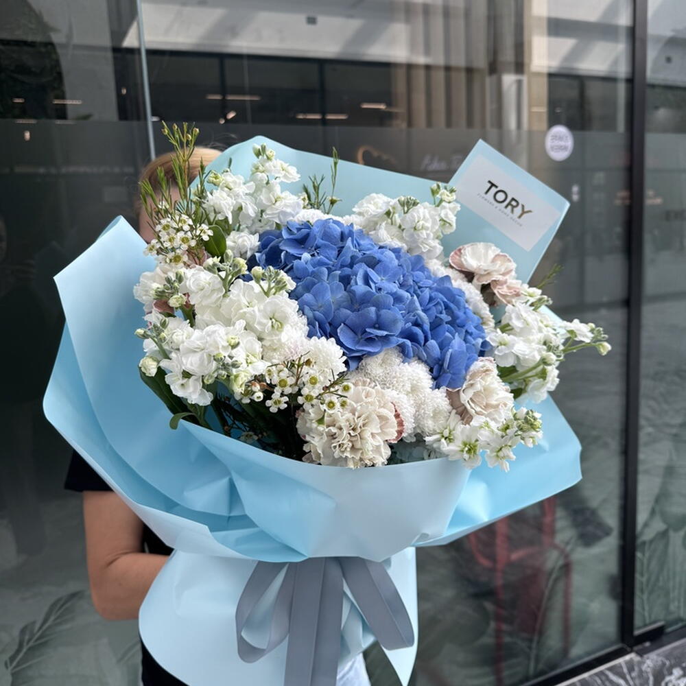 Composition: Hydrangea - 1, Chrysanthemum Santini - 5, Mattiola spray - 5, Chamelacium - 5, Dianthus - 5 Sizes: WIDTH - 55CM; HEIGHT - 60CM; LENGTH - 60CM; (including packaging) Размер: 55 x 60 x 60 см