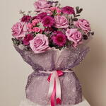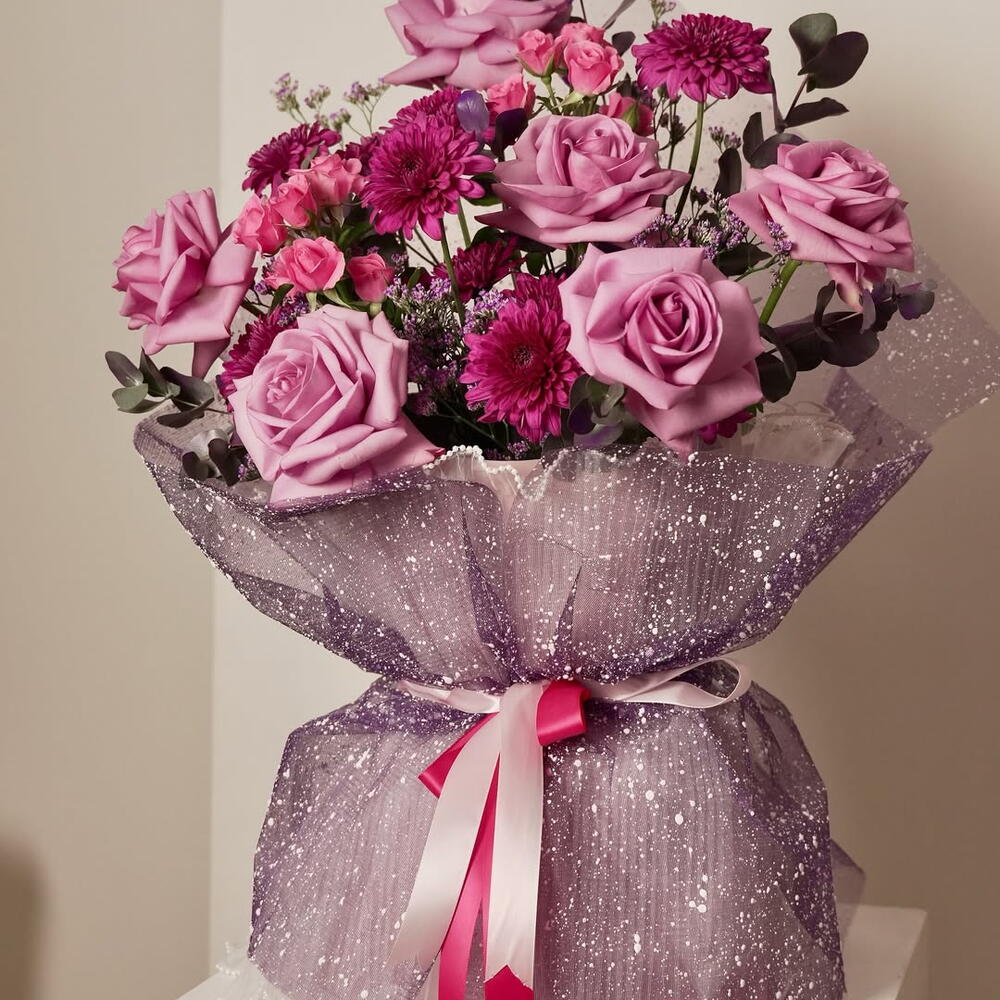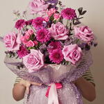 Шагните в мир, где элегантность встречается с игривостью, где каждый цветок рассказывает историю, и где Magical становится не просто букетом — а настоящим переживанием. Созданная для тех, кто верит в необыкновенное, эта композиция — симфония мягких пастельных тонов, богатых текстур и едва уловимого блеска. В её сердце 10 бархатистых роз нежно-розового оттенка источают вечную романтику, их тонкие лепестки раскрываются, как шепчущиеся тайны. Вокруг них 30 кустовых роз розового цвета создают пышную, роскошную текстуру, придавая букету глубину и движение, словно каждый стебель танцует сам по себе. 10 изысканных георгин добавляют структуру и художественность, возвышая композицию до уровня скульптурного шедевра. Чтобы смягчить контуры и добавить нотку воздушной мечтательности, по всему букету словно парят 10 веточек фиолетовой гипсофилы, напоминающей звездную пыль, пойманную солнечным светом. Лавандовая статица вносит нежный, игривый контраст, а свежий эвкалипт переплетает тонкую зелёную элегантность через букет, придавая свежесть и баланс ярким розовым и фиолетовым тонам. Всё это аккуратно упаковано в фиолетовую обёртку с блёстками, добавляя ровно столько сияния — роскошно, но игриво, современно, но вневременно. Magical — идеальный подарок для моментов, которые стоит запомнить: дней рождения с королевским звучанием, юбилеев, наполненных вечностью, или просто чтобы дать понять кому-то, что его присутствие в вашей жизни по-настоящему волшебно. Каждый стебель, каждый оттенок и каждое мерцание подобраны со вниманием и намерением, создавая букет, который не просто выглядит красиво — он ощущается волшебным. Сокровище для глаз, наслаждение для души и доказательство элегантности, которое остаётся в памяти задолго после того, как цветы были вручены.