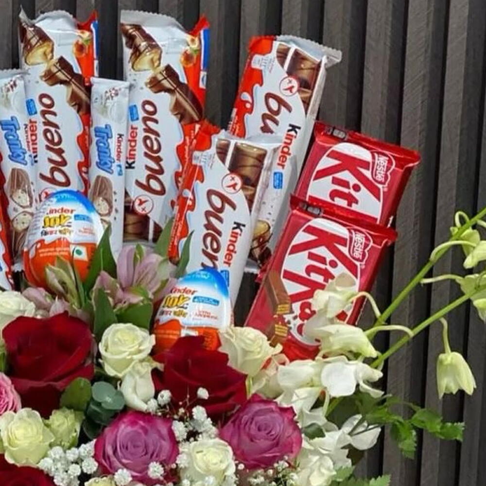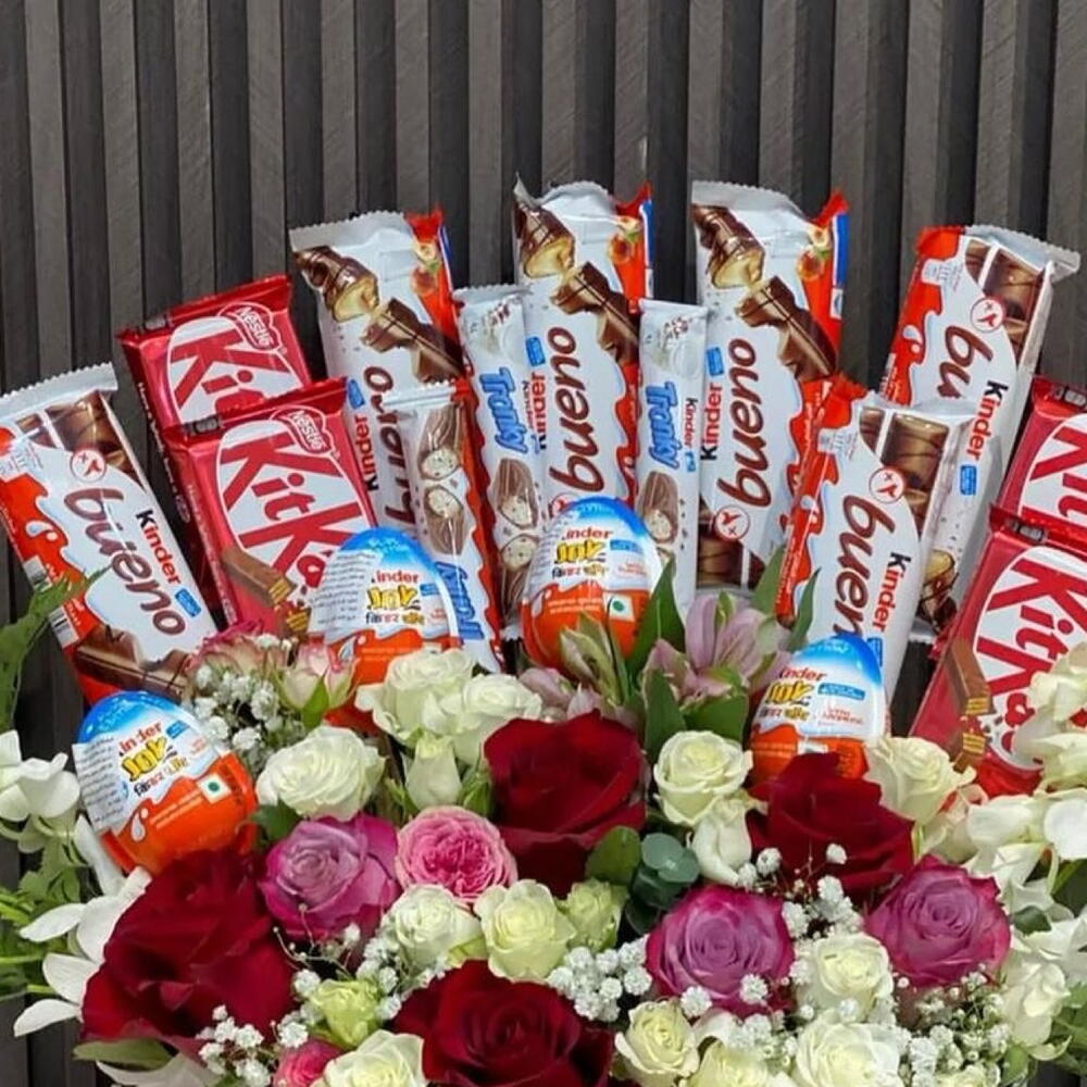 Kinder maxi - 4 шт. зеленая листва - 4 шт. red roses - 4 шт. pink roses - 4 шт. white roses - 5 шт. батончики Kinder Bueno - 6 шт. яйца Киндер Джой - 4 шт. батончик KitKat - 4 шт. гипсофила гипсофила - 4 шт.
