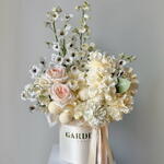 Delicate box of creamy white and blush flowers with elegant roses — a graceful and timeless gift for any special moment. Includes white hydrangeas, french roses, delphiniums and ranunculus. The set comes with a personalized card, care instructions and flower fertilizer. *Flower delivery today Perfect for: - a gift for her; - weddings or anniversaries; - birthdays; - luxurious decor items; - formal events; - perfect dates; - gift add-ons; - gifts with no occasion.