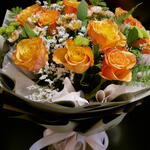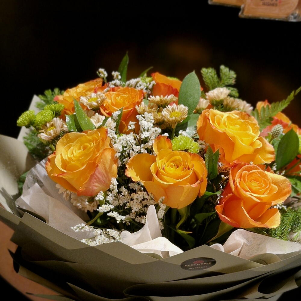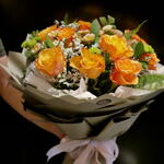 Ruscus - 7 шт. orange rose - 10 шт. wrapping paper - 12 шт. папиросная бумага - 2 шт. астремелия - 4 шт. лимониум белый стебель - 10 шт.