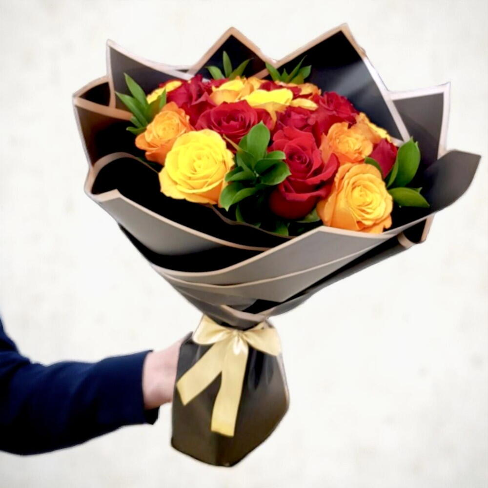 Этот яркий букет — праздник цвета и радости! Ярко-жёлтые, насыщенно-красные и тёплые оранжевые розы красиво сочетаются с пышной зеленью, создавая эффектную композицию. Идеален для дней рождения, праздников или просто чтобы подарить улыбку — этот букет излучает тепло и счастье. Для максимальной свежести как можно скорее поставьте букет в чистую воду. Меняйте воду ежедневно, подрезайте стебли наискось каждые 2–3 дня и держите его подальше от прямых солнечных лучей и сквозняков, чтобы дольше наслаждаться его красотой.