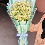 30 стеблей матрикарии (с 100+ цветами) в синем и прозрачном двойном листе для обертывания букета.