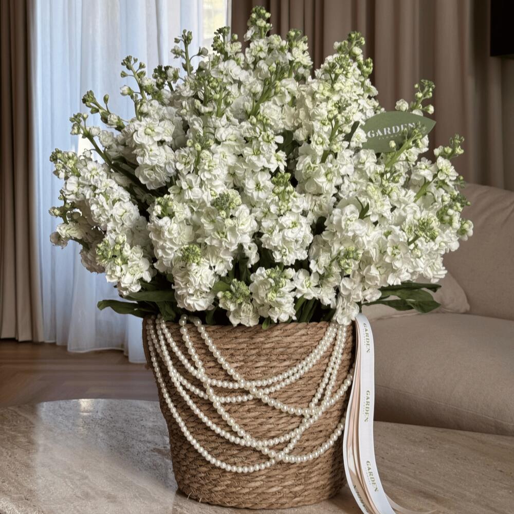 Basket of white matthiola (size L)