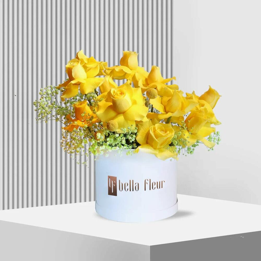 Средняя коробка Bella Box с композицией из свежих цветов: жёлтые розы, краспедия и гипсофила.