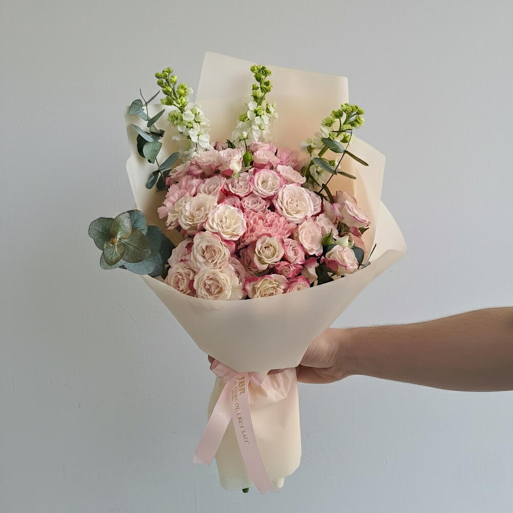 розовая мини-роза - 10 шт. маттиола белая - 3 шт. youcalebtos - 4 шт.