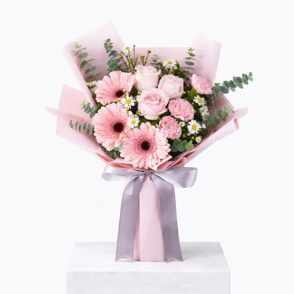 Two-tone pink rflowers tied in a hand-tied bunch — charming and natural. Pink Gerbera 3 Stems, Pink Rose 3 Stems, Pink Carnation 3 Stems, Eucalyptus 5 Stems, Camomile 2 Stems