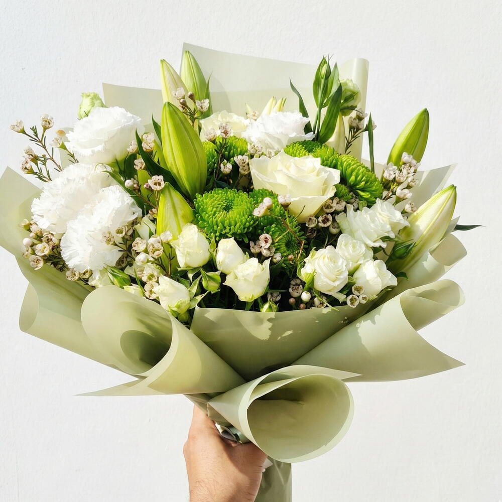 Букет Mella — это изысканная бело‑зелёная цветочная композиция, воплощающая элегантность, чистоту и современную утончённость. Созданный из свежих белых роз, нежной эустомы, изящных лилий и ярких зелёных хризантем, этот букет создаёт спокойную и роскошную эстетику. Дополненный восковыми цветами и спрей‑розами и завернутый в мягкую бумагу шалфейного оттенка, он является идеальным выбором для свадеб, поздравлений, новых начинаний, выражения соболезнования или для премиальной доставки цветов в Дубае. Его сбалансированная цветовая палитра и пышная фактура делают его вневременным и универсальным цветочным подарком.