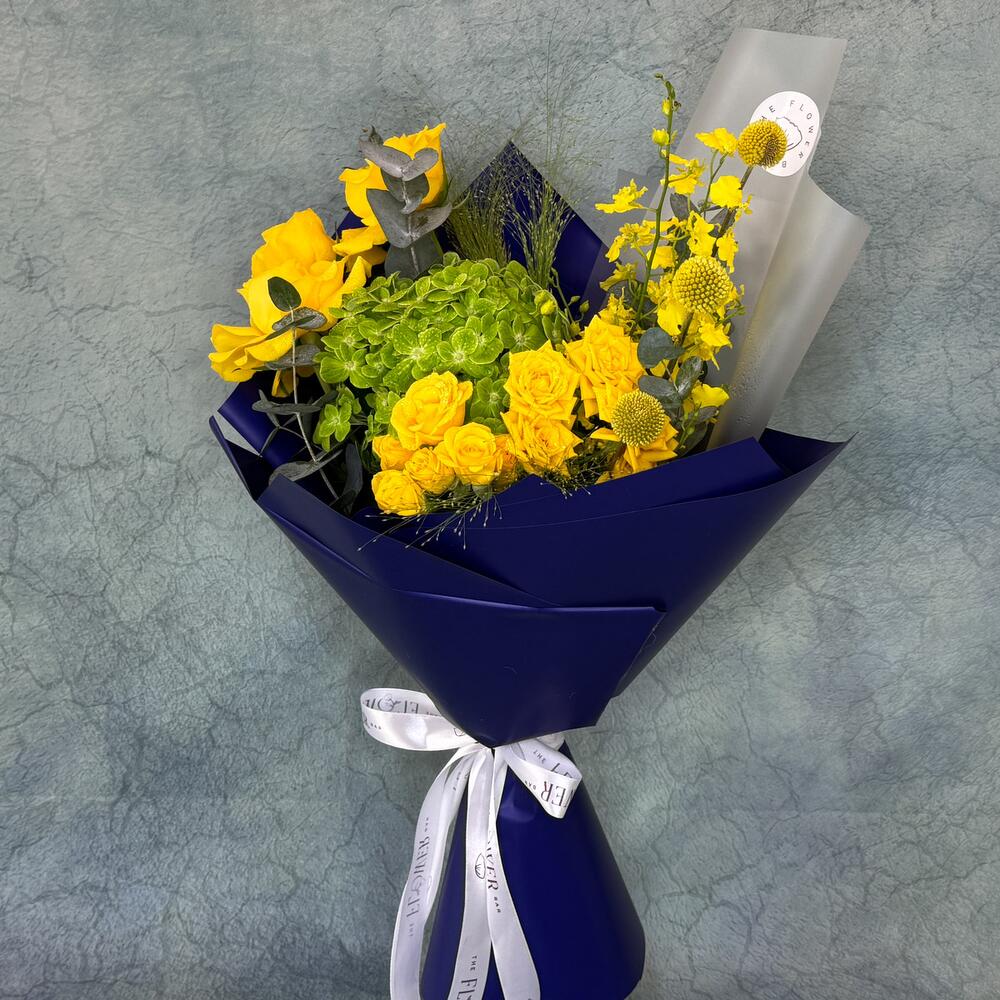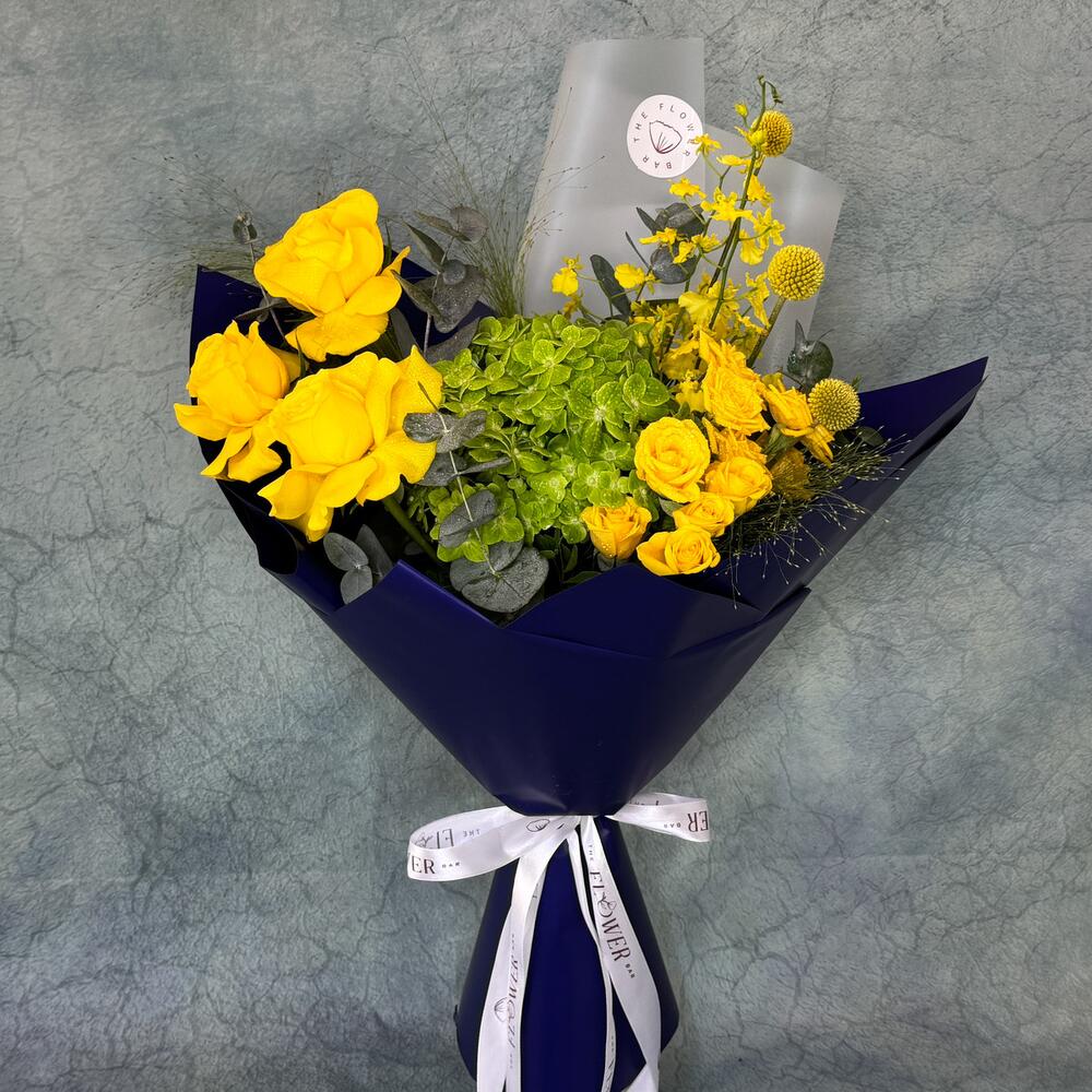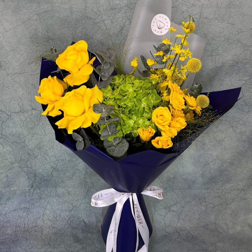 Поднимите настроение с Mellow Yellow, прекрасным букетом из свежих жёлтых роз и пышной зелёной гортензии. В тёмно-синей упаковке эта очаровательная композиция наверняка украсит любую комнату и вызовет улыбку на вашем лице.
