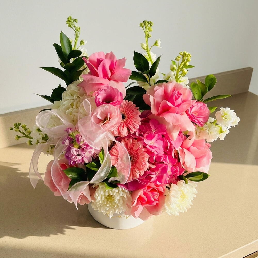 Композиция «Мелодия Сада» представляет собой сочетание рускуса, маттиолы, розы «Кэнди Гёрл» и гортензии в белых и розовых тонах, создавая гармоничный и изысканный букет. Включает 8 рускусов, 1 белую гортензию, 2 белые маттиолы, 5 розовых маттиол, 5 роз «Кэнди Гёрл», 3 фисташки; гармоничная цветовая палитра; идеально подходит для свадеб и юбилеев. Теги: элегантный свадебный букет, цветы на годовщину, романтическая цветочная композиция, розовые розы