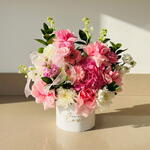 Ruscus - 8 шт. hydrangea pink - 1 шт. hydrangea white - 1 шт. gerbera pink - 2 шт. маттиола белая - 5 шт. маттиола розовая - 1 шт. роза конфета девочка - 5 шт. хризантема пина колада - 2 шт. писташковый лист - 3 шт.