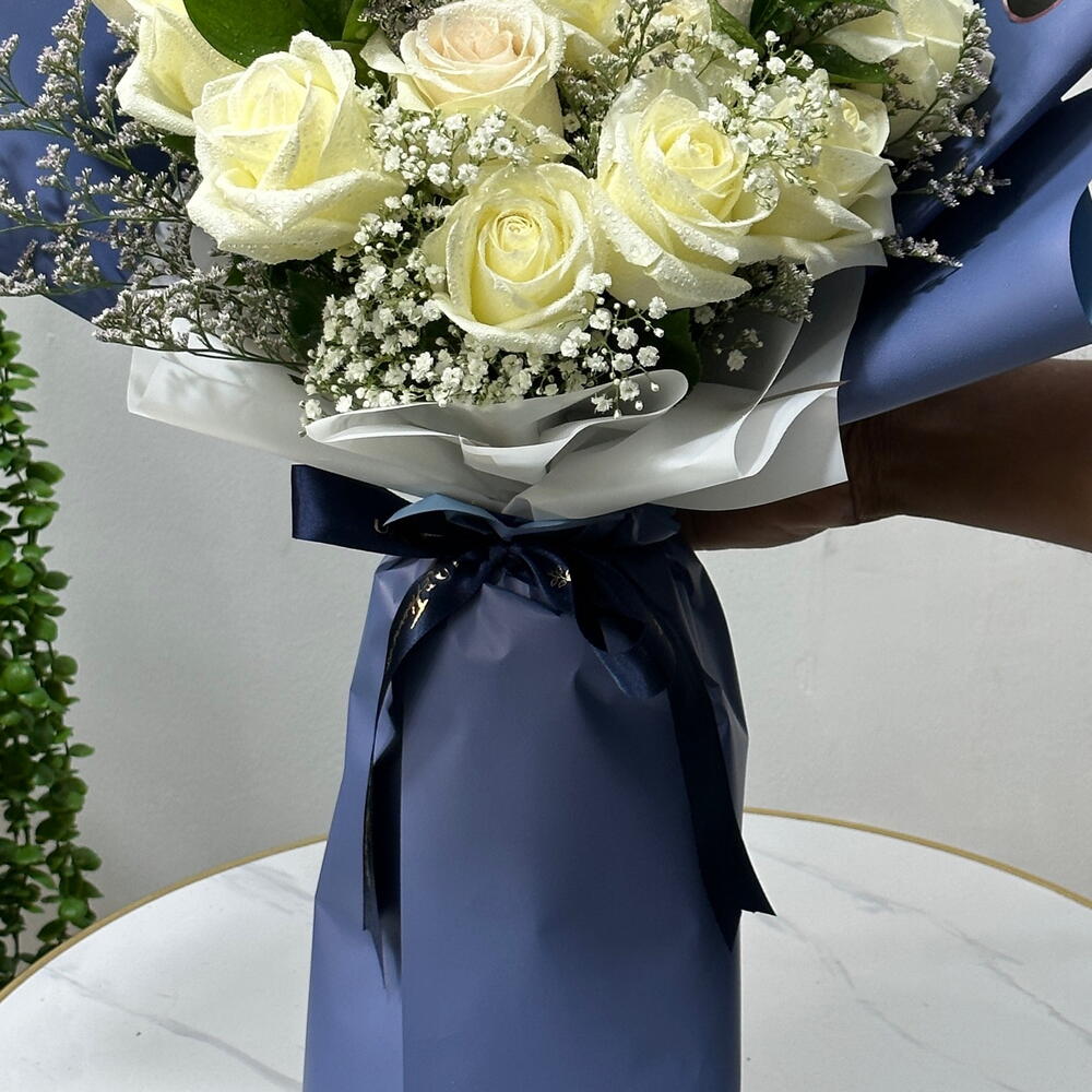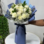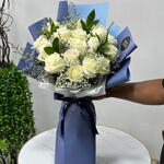 Подарите умиротворение, чистоту и искренние эмоции с нашим букетом «Безмятежность» — изящной композицией из 15 белоснежных роз, украшенных нежным гипсофилом, в элегантной упаковке из успокаивающей голубой бумаги с мягкой белой лентой. Белые розы символизируют невинность, искренность и новое начало, а сине-белая композиция добавляет нотку спокойствия и тихой элегантности. Идеально подходит для: – 🕊️ Сочувствия и воспоминаний – 🎉 Бэби-шоуэров и благословений – 💌 Проявления заботы – 👰 Подарков на свадьбу или помолвку Этот букет не просто красив — он дарит момент спокойствия, чистоты и непреходящих чувств. 📦 Доставка доступна в тот же день — закажите сейчас, чтобы поделиться цветущим спокойствием.