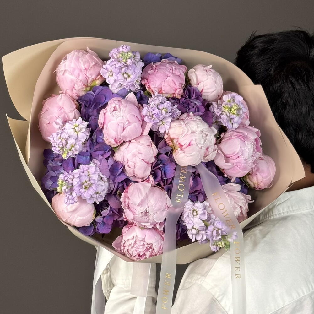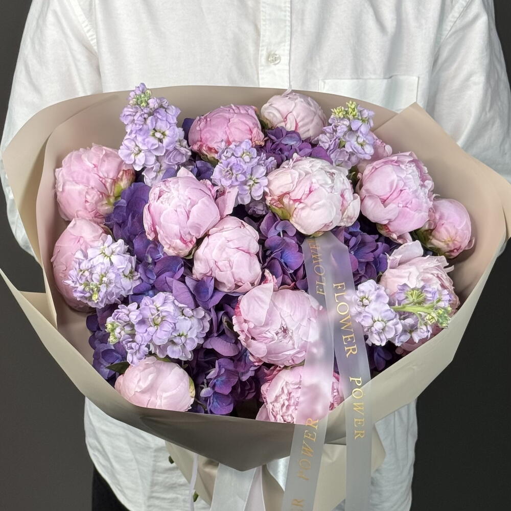 Нежный и ароматный букет из роскошных пионов, воздушной гортензии и душистой маттиолы. Эта композиция — словно поэзия в цветах: элегантная, женственная и полная очарования. Идеальный подарок на день рождения, рождение ребёнка, романтический подарок или просто чтобы украсить чей-то день красотой и ароматом. 🌸 Лёгкий, нежный и незабываемый — такой же, как и тот, кому вы его дарите.