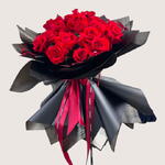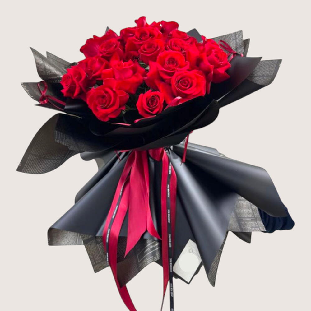 Впечатляющая композиция из темно-красных роз, завернутых в драматичные чёрные слои с выразительными багровыми лентами—создана, чтобы выразить интенсивную страсть, тайну и неотразимую романтику.