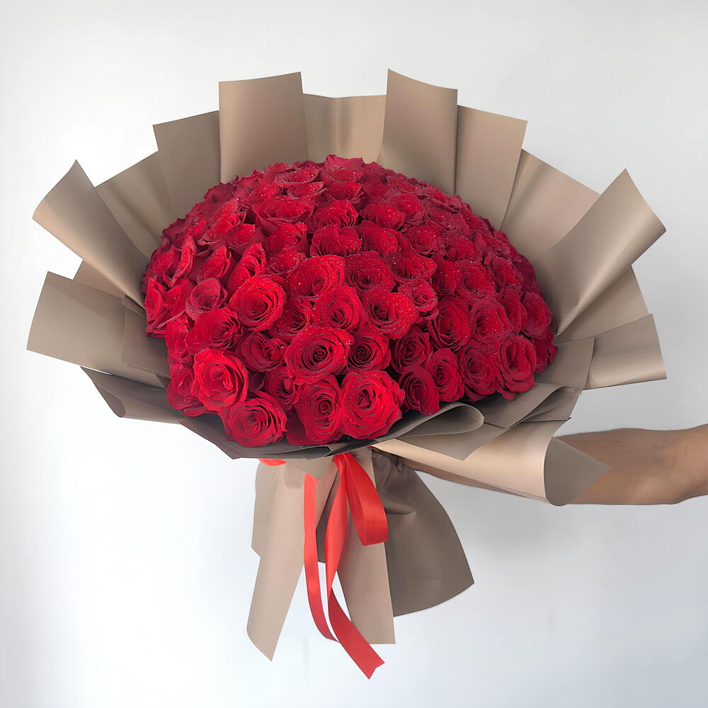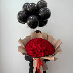 Red rose - 101 шт. Ribbon - 1 шт. Wrapping - 10 шт. черный латексный шар - 8 шт.