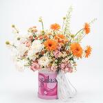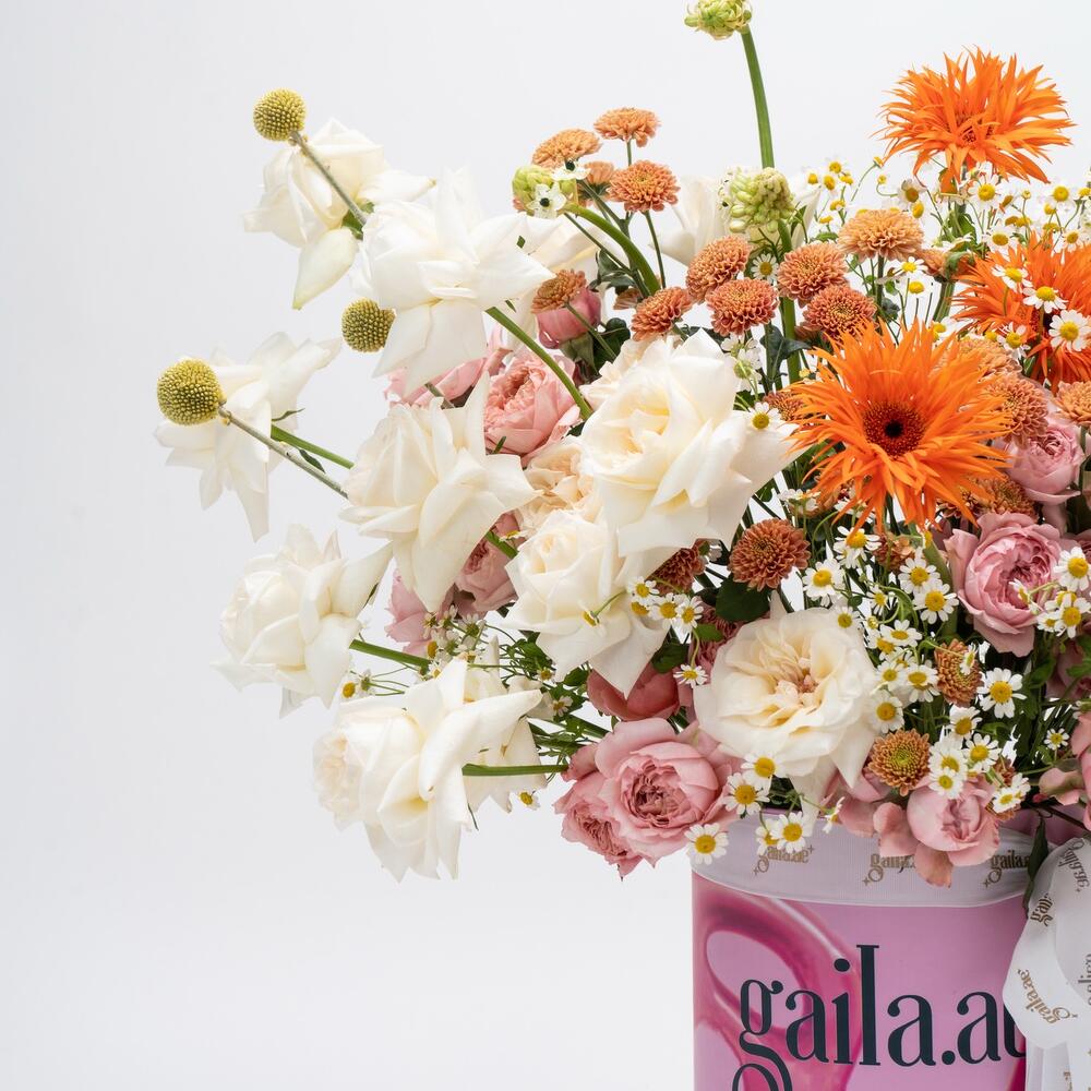 Этот исключительный экземпляр из нашей коллекции Florists Specials представляет собой гармоничную композицию тщательно отобранных цветов, призванную доставить удовольствие вашим чувствам. Он состоит из четырёх пионовидных роз, излучающих неоспоримое очарование, в сочетании с пятью сияющими розовыми розами. Четыре цветка сантрини добавляют экзотическую нотку, красиво сбалансированную пятью весёлыми маргаритками. Два величественных дельфиниума устремляются вверх, в паре с пятью элегантными белыми розами Охара. Эта прекрасная аранжировка дополнительно усилена двумя гроздьями яркого вибурнума и подчеркнута четырьмя насыщенно-оранжевыми паучьими герберами для динамичного цветового акцента. Это великолепное сочетание обещает принести жизнь и роскошь в любое событие.