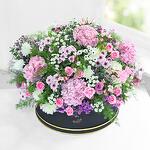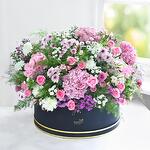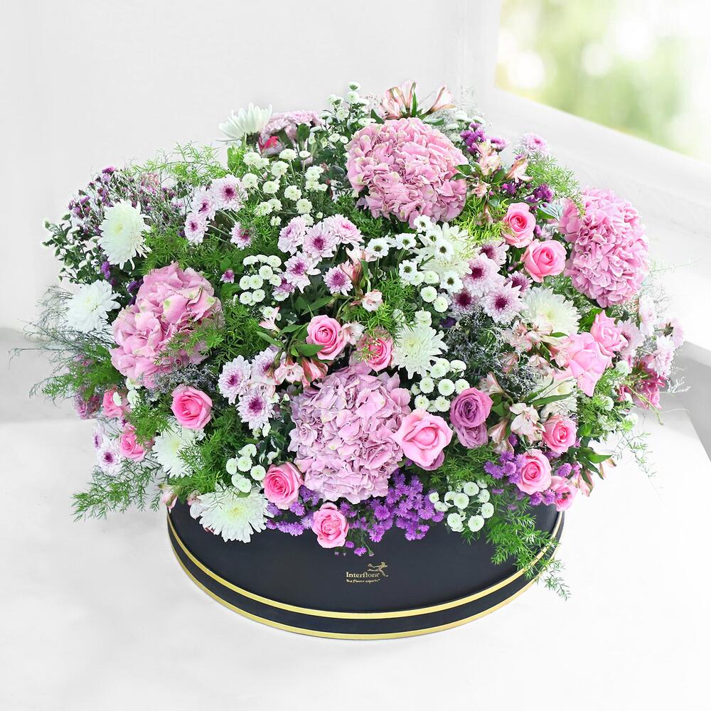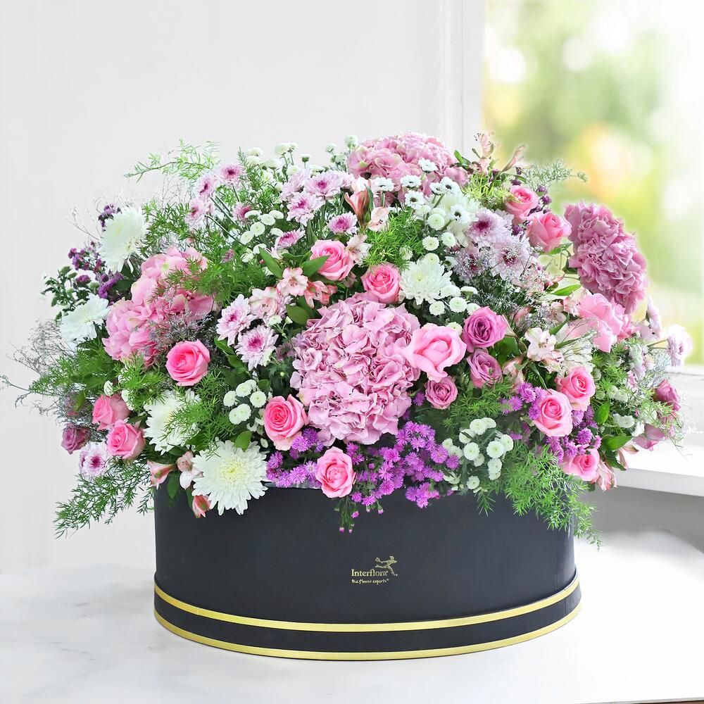 Гармоничные цветочные оттенки объединяются, чтобы создать эту величественную роскошную коробку-корзину, которая станет королевским украшением любого праздника: розы цвета морской волны, темно-фиолетовые розы, светло-розовые альстромерии, белые соцветия, фиолетовый лимониум, фиолетовая маргаритка, розовая гортензия и белые хризантемы-пуговицы.