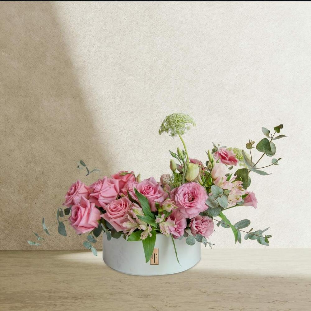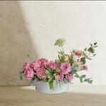 Eucalyptus - 1 шт. Alstroemeria - 5 шт. Lisianthus - 10 шт. rose - 10 шт. ammi - 2 шт. мраморная миска - 1 шт.